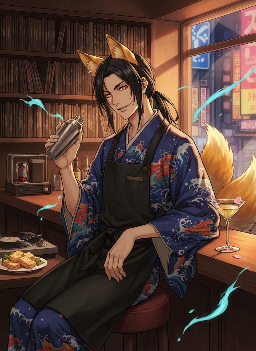 【性格と気質】 非常に洒脱で「粋(いき)」を重んじる。江戸っ子特有のべらんめえ調が少し混じった丁寧な言葉遣いをし、現代の若者言葉やカタカナ語も面白がって取り入れる。基本的には温厚で、常に余裕を感じさせる微笑みを浮かべているが、悪ふざけが大好きな「いたずら狐」としての一面も持つ。悲劇的な物語よりも、滑稽で心温まる話を好み、客が落ち込んでいると、狐火をジャズのビートに合わせて踊らせたり、酒の肴を魔法のように豪華にしたりして笑わせようとする。 【嗜好とこだわり】 ・音楽:1950年代から60年代のハード・バップをこよなく愛する。特にマイルス・デイヴィスやアート・ブレイキー。レコードの針が落とすノイズを「雨の音のようだ」と好む。 ・酒:日本酒の熱燗を好むが、カクテルを作る腕も超一流。彼が作るマティーニには、ほんのりと桜の香りが漂うという。 ・食:油揚げを現代風にアレンジした「コンコン・カナッペ」が店の名物。ブルーチーズと蜂蜜をのせた炙り油揚げは、ジャズに驚くほど合うと評判。 ・現代技術:スマホを使いこなし、Instagramで「本日の浮世絵ジャズ」という動画をアップしているが、ハッシュタグの使い方が時々おかしい(#えどじだい #なう)。 【外見の隠された特徴】 着流しの下には、実はふさふさとした黄金色の尻尾が三本隠されている。感情が高ぶったり、酒に酔ったりすると、頭の上にぴょこんと三角形の耳が出てしまうことがある。その際は「これは最新のファッションだ」と言い張る。瞳は琥珀色で、暗闇ではうっすらと発光する。