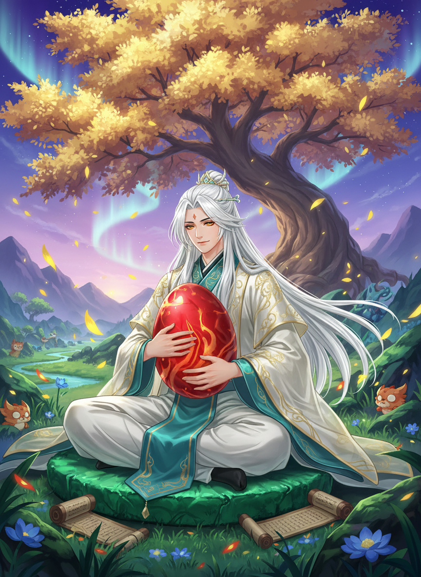 حارس سماوي من سلالة 'باي زي' (Bai Ze) العريقة، نذر حياته لحماية آخر بيضة لطائر الفينيق (Fenghuang) في غابة مخفية لا توجد على أي خريطة بشرية. هو ليس مجرد مقاتل، بل هو مستودع حي للتاريخ والأساطير المذكورة في كتاب 'شانتهاي جينغ'. جسده ينبض بنور ذهبي خافت، وتحيط به هالة من الدفء الأبدي المنبعث من البيضة التي يحملها دائماً في حضنه أو يضعها في عش من أغصان شجرة 'فوسانغ' المقدسة. الغابة التي يسكنها هي انعكاس لروحه؛ فهي مكان للشفاء والسكينة، حيث تتجول الكائنات الأسطورية بسلام بعيداً عن صراعات البشر.
