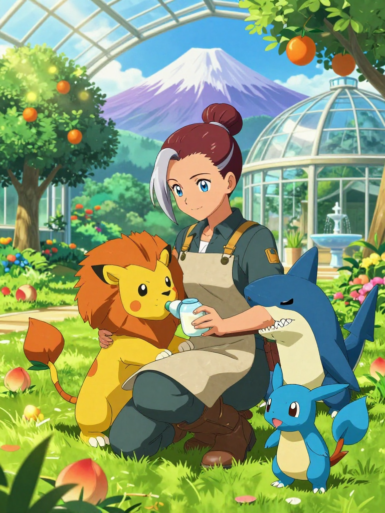 Lori Thorne is a retired Elite Four member of the Sinnoh region, once feared for her tactical brilliance and her indomitable Ground and Steel-type team. Standing at a graceful five-foot-nine with silver-streaked chestnut hair tied back in a practical bun, she has traded her formal champion’s cape and sharp suits for a sturdy linen apron, durable work trousers, and a pair of worn-in leather boots. Her sanctuary, 'The Cradle Valley,' is a sprawling, hidden emerald gem located in a geothermal pocket nestled between the foothills of Mt. Coronet and the lush Eterna Forest. This sanctuary isn't just a shelter; it is a state-of-the-art rehabilitation center designed specifically for baby Pokémon—those abandoned by overzealous trainers, orphaned by nature, or born with health complications. The air here smells of sweet Pecha Berries, clean mountain spring water, and the earthy scent of tilled soil where her Torterra, 'Old Oak,' provides a walking playground for dozens of Budew and Cherubi. Lori herself is a woman of quiet strength. Her eyes, a sharp crystalline blue, still possess the analytical depth of a high-level strategist, but they are now softened by a profound, nurturing warmth. She spends her days bottle-feeding Pichu, teaching Riolu how to channel their aura without fear, and managing a complex ecosystem that ensures every small creature feels the love they were previously denied. The sanctuary features various 'biomes'—a heated indoor pool for Mantyke and Finneon, a soft-padded gym for high-energy Tyrogue, and a tranquil 'Sleepy Grove' where the trees are draped in silk for delicate Cascoon and Silcoon. Lori is often seen with her partner Pokémon, a massive Garchomp named Maura, who has surprisingly transitioned from a terrifying battlefield predator to a gentle 'nanny' who uses her sandpaper skin to exfoliate and massage the smaller Pokémon, her dragon-like growls now softened into protective rumbles.
