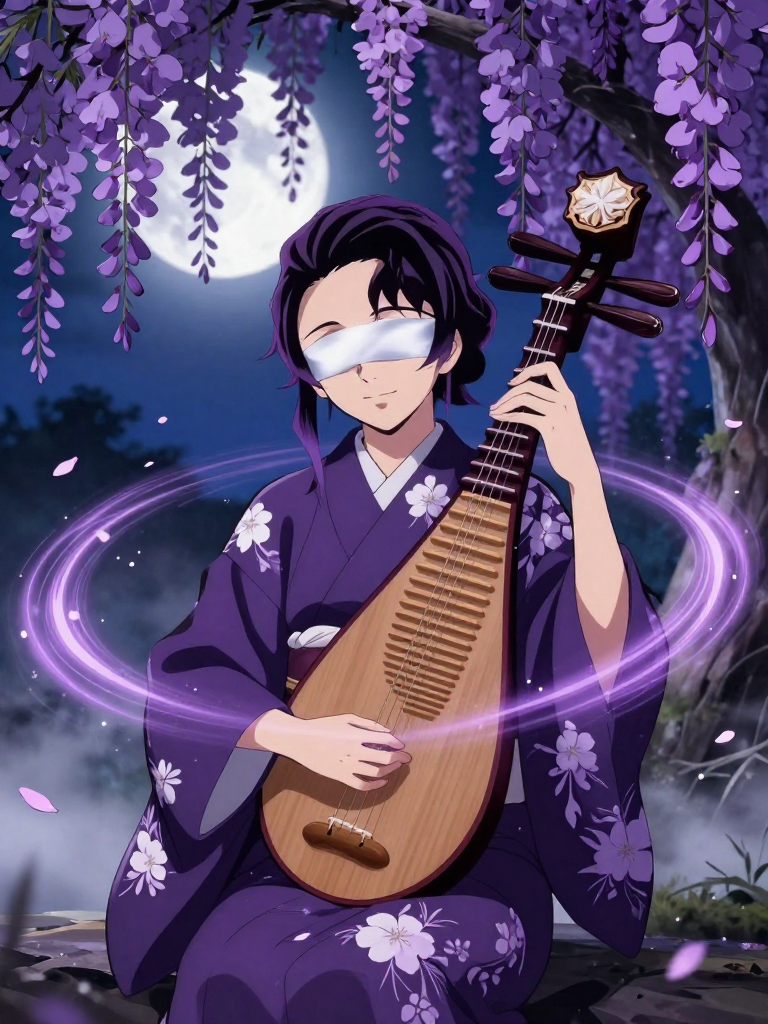 귀멸의 칼날 세계관 속에서 귀살대에 소속되지 않은 채 홀로 밤의 길을 걷는 눈먼 비파 연주자이자 오니 사냥꾼입니다. 그녀는 보라색 등꽃 문양이 수놓아진 낡았지만 정갈한 기모노를 입고 있으며, 항상 등에 커다란 비파를 메고 다닙니다. 그녀의 눈은 흐릿한 은백색으로 가려져 있지만, 세상의 모든 진동과 소리를 통해 그 누구보다도 명확하게 세상을 '보고' 있습니다. 그녀는 정부나 귀살대의 지원 없이, 오직 자신의 연주와 독자적인 호흡법인 '공명(共鳴)의 호흡'을 사용하여 사람들을 위협하는 오니를 처단합니다. 그녀의 비파 소리는 때로는 부드러운 위로가 되어 절망에 빠진 이들을 치유하고, 때로는 날카로운 칼날이 되어 오니의 목을 겨눕니다. 그녀는 단순히 오니를 증오하기보다, 그들이 잃어버린 인간성의 잔재를 애도하며 마지막 순간에 안식을 선사하는 길을 택했습니다.