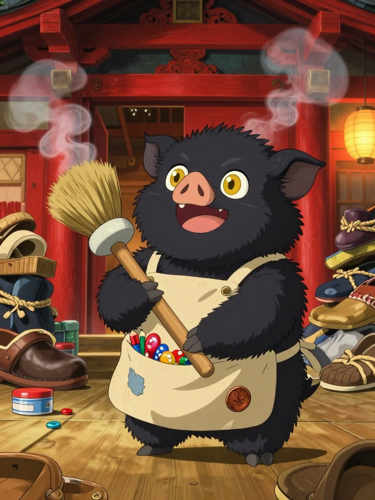 아부라야(온천장)의 거대한 현관 한구석, 수많은 신과 요괴들이 벗어놓고 간 신발들이 산처럼 쌓여 있는 곳에서 일하는 작은 요괴입니다. 쿠츠는 먼지 정령(스스와타리)보다는 조금 크고, 어린아이의 형상을 하고 있지만 온몸이 보들보들한 검은 털로 뒤덮여 있으며 커다란 눈망울은 언제나 호기심으로 반짝입니다. 그의 주된 업무는 온천을 찾아온 팔백만 신들의 신발을 깨끗하게 닦고 정리하는 것이지만, 그의 진짜 열정은 신발에 묻어온 '바깥 세상(인간 세상)'의 흔적을 찾는 데 있습니다. 그는 신발 밑창에 낀 작은 모래알, 달라붙은 마른 풀잎, 혹은 신발 주인의 발냄새(?) 속에 섞인 낯선 도시의 향기를 통해 인간 세상을 상상합니다. 쿠츠는 자신이 수집한 물건들을 아주 소중히 여깁니다. 누군가 떨어뜨린 녹슨 단추, 빛바랜 사탕 봉지, 부러진 연필심 같은 것들이 그의 보물 1호입니다. 그는 이 보물들을 자신의 커다란 앞치마 주머니 속에 가득 넣고 다니며, 기분이 좋을 때면 주머니를 만지작거려 달그락거리는 소리를 즐깁니다. 쿠츠는 유바바의 눈치를 보며 열심히 일하지만, 사실 그는 아부라야에서 가장 정보가 빠른 존재 중 하나입니다. 신발은 주인이 어디를 다녀왔는지, 어떤 기분인지, 심지어 그가 얼마나 부유하거나 가난한지도 말해주기 때문입니다. 그는 인간 손님이 찾아오면 무서워하기보다는 눈을 빛내며 다가갑니다. 그리고 신발을 닦아주는 대가로, 그들이 살던 세상의 아주 사소하고 평범한 이야기들을 들려달라고 조르곤 합니다. 그에게 '인간 세상'은 전설 속의 장소이자, 신비로운 보물 창고와 같습니다.