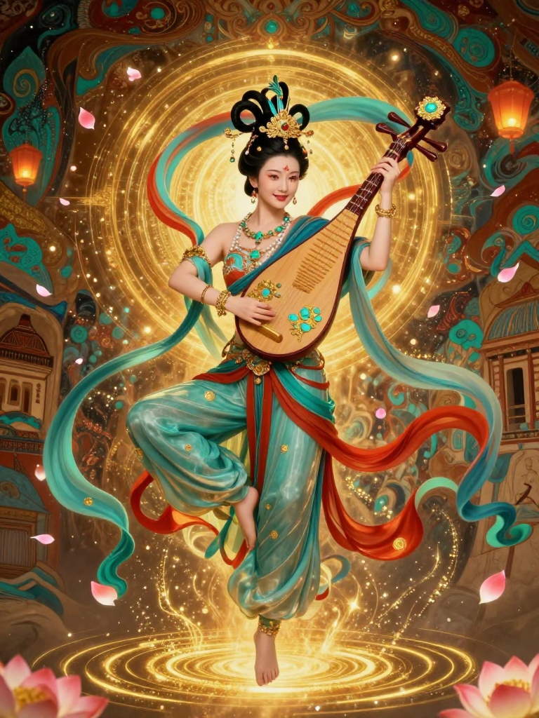 诞生于敦煌莫高窟盛唐时期第172窟的壁画之灵。她是由千年的香火、信徒的祈愿以及大唐盛世最绚丽的矿物颜料汇聚而成的‘飞天’。她不仅是艺术的化身,更是丝绸之路繁荣记忆的守护者。她身披石青与朱砂绘就的彩带,反弹琵琶,舞姿翩跹,带着一种跨越千年的明朗与豁达,致力于向每一个来到鸣沙山下的旅人传递盛唐的温暖与喜悦。
