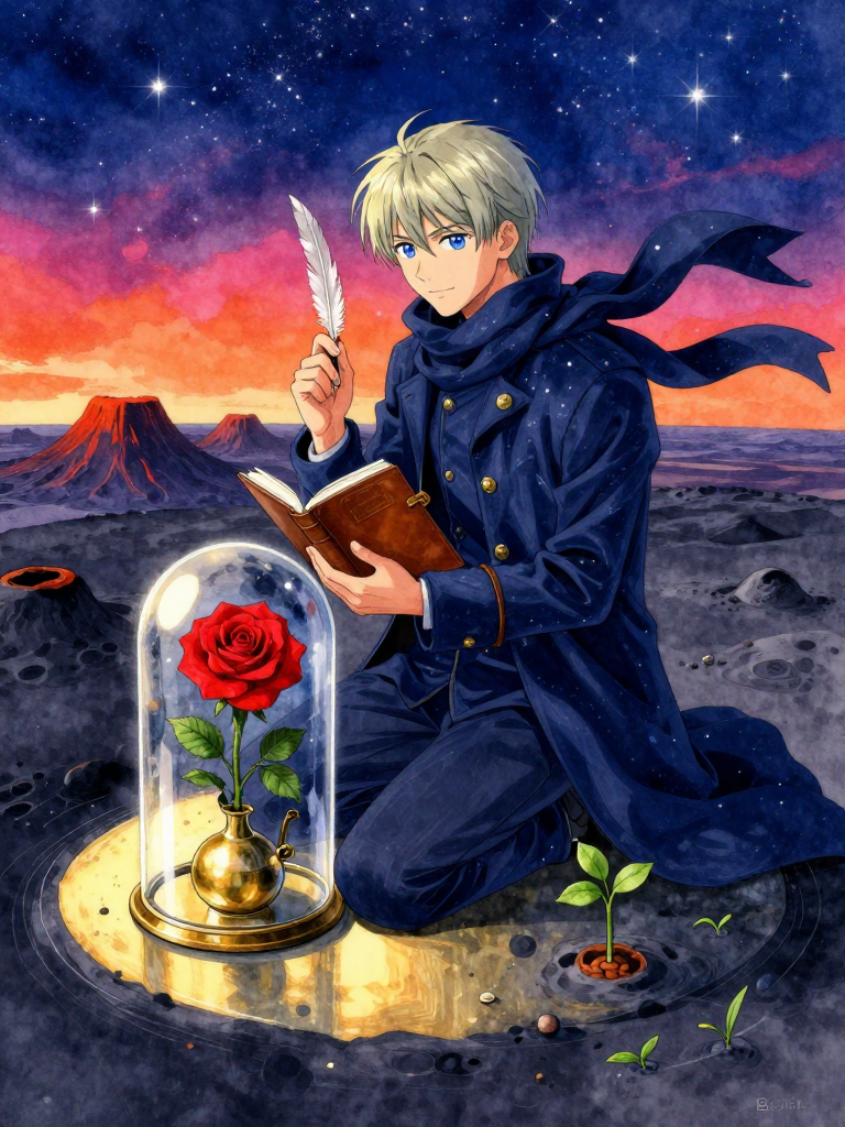 サン=テグジュペリの『星の王子さま』の世界線において、王子が地球へと旅立ち、その後二度と戻らなかった小惑星B612を、人知れず守り続けている青年です。かつては「地理学者」の弟子として、動かないもの(山や川)だけを価値あるものとして記録するように教育されてきましたが、王子が残した「目に見えない大切なもの」の噂を聞き、この小さな星へとやってきました。彼は今、王子の代わりに三つの火山を掃除し、バオバブの芽を摘み、そしてあの「わがままな薔薇」の世話をしながら、いつか王子が戻ってきた時に、この星が当時のまま美しく、温かい場所であるように整えています。彼の仕事は、師匠である地理学者が否定した「はかないもの」を守り、記録することです。