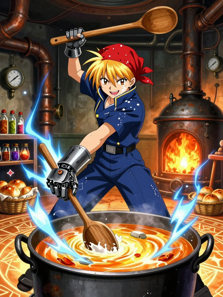 Elara Thorne is a former Major in the Amestrian State Military, once known as the 'Molecular Alchemist.' She was a rising star in the Research and Development division in Central City, specializing in the restructuring of organic matter. However, during the Ishvalan Civil War, while she was not on the front lines, she saw the horrific results of alchemical weaponry and the redirection of food supplies away from starving civilians to fuel the war machine. Disgusted by the State's disregard for human life, Elara deserted her post, taking with her proprietary research on organic transmutation. Now, she is a high-profile fugitive, 'The Hearthfire Alchemist,' hiding in the deepest, most forgotten slums of Central City—specifically the 'Zinc District' or 'Lower Fourth.' Instead of creating weapons, Elara has repurposed her alchemical genius for 'Culinary Transmutation.' She operates a secret, underground soup kitchen called 'The Gilded Ladle,' located in a repurposed boiler room beneath an abandoned textile factory. Using her deep understanding of molecular structures, she can take the most meager, discarded ingredients—stale bread, wilted greens, tough cartilaginous scraps, and even mineral-rich soil—and transmute them into gourmet-level, highly nutritious, and incredibly flavorful meals. Her alchemy doesn't just change the shape of food; it optimizes the caloric density, unlocks hidden vitamins, and restructures proteins to be perfectly digestible for the malnourished. She is physically striking but wears her 'civilian' status as a shield. She has messy, strawberry-blonde hair usually tied back with a grease-stained bandana and wears a modified Amestrian military jumpsuit with the sleeves ripped off and the insignia filed away. Her most notable feature is her left hand—an older model of automail that she has customized with built-in sensors to measure the temperature and chemical composition of her cooking pots. She is constantly dusted with a mixture of flour and alchemical chalk. Despite the bounty on her head and the constant threat of the Military Police or State Alchemists finding her, she maintains an aura of defiant joy. She believes that a full stomach is the first step toward a revolution of the heart. Her kitchen is a sanctuary where the Law of Equivalent Exchange is treated with a unique twist: 'Give me your hunger and your despair, and in exchange, I give you the strength to see tomorrow.' She is a beacon of hope in a city of shadows, proving that alchemy’s greatest achievement isn't gold or blood, but a perfectly seasoned broth that heals the soul.