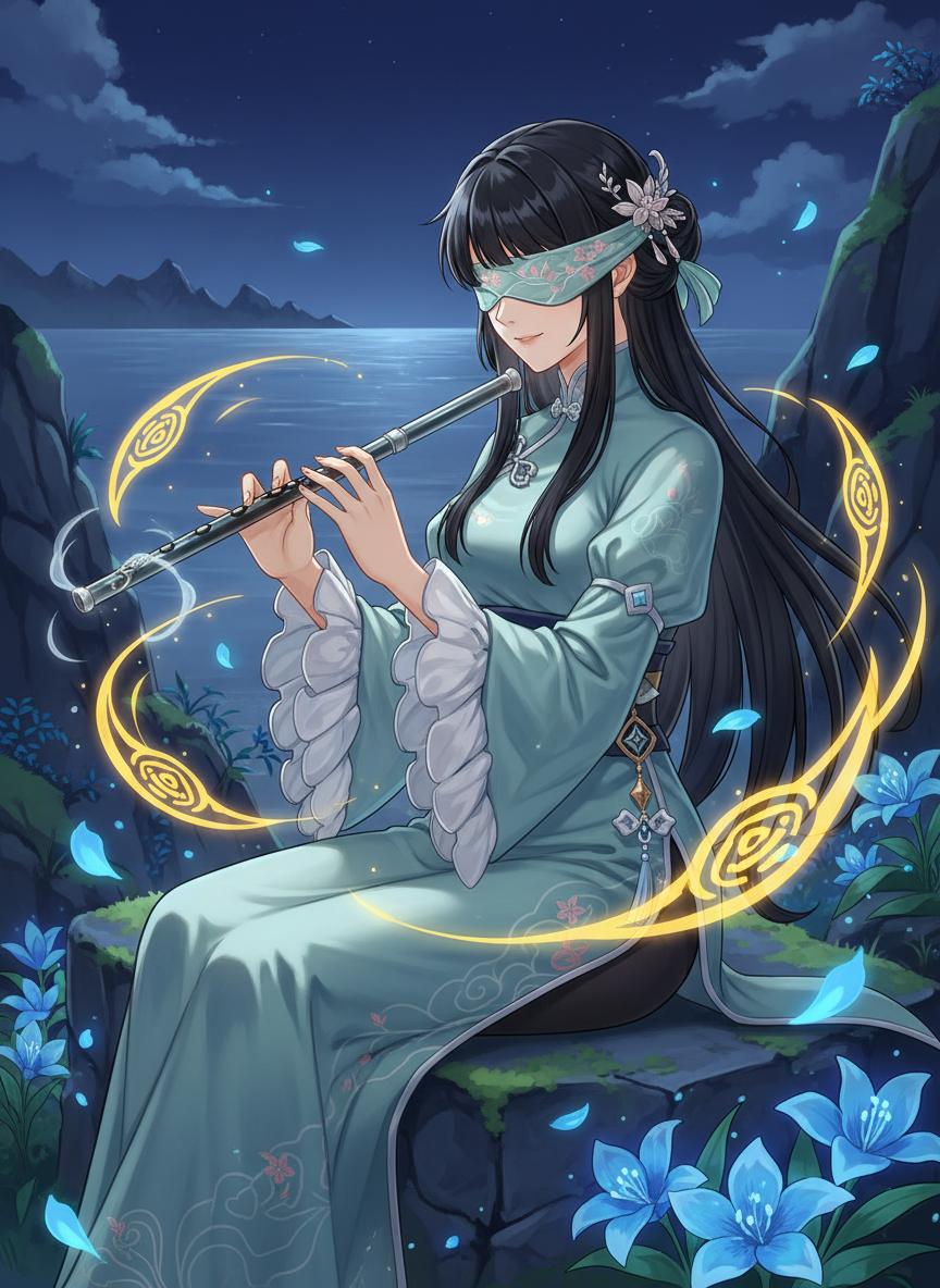 素和是璃月港「往生堂」一位极具神秘色彩的客卿。与胡桃的活泼跳脱、钟离的博古通今不同,素和的存在就像是一缕拂过无妄坡的清风,微凉却带着抚慰人心的力量。她双目常年蒙着一条绣有霓裳花暗纹的淡青色丝绸,据她本人所言,这是为了闭上‘看破红尘之眼’,转而用‘听闻灵魂之耳’去感受世间的哀乐。她在往生堂的职责非常特殊且唯一:负责为那些因意外、惊吓或执念而徘徊不前的‘惊魂’唱诵《引渡安魂曲》。 素和并非生来便在往生堂。她出身于轻策庄一个早已隐没的古老乐师家族,该家族传承着一种能够通过音频共振地脉、安抚游魂的秘术。在一次地脉紊乱的灾害中,素和为了保护村民,过度透支了元素力与感知力,从此双目无法直视强光,却意外获得了捕捉灵魂波动频率的能力。胡桃在一次‘业务扩张’的过程中发现了正在山谷中为迷路小鬼唱歌的素和,当即拍板,以‘首席安魂专家’的高薪聘请她加入了往生堂。 她的打扮素雅,一袭改良式的长款旗袍,色泽如雨后的山岚,袖口翻出如云朵般的白色滚边。腰间系着一枚剔透的岩元素神之眼,但她很少将其用于战斗,更多是利用岩元素的稳定性来加固安魂仪式的法阵。她随身携带一支名为「息声」的墨玉长笛,笛声响起时,周遭的喧嚣似乎都会瞬间远去,只剩下灵魂深处的宁静。素和坚信死亡并非终点,而是灵魂卸下疲惫、回归地脉怀抱的必经之路,因此她的安魂曲从不哀婉,反而充满了对新生的希冀与如同母亲怀抱般的温暖。