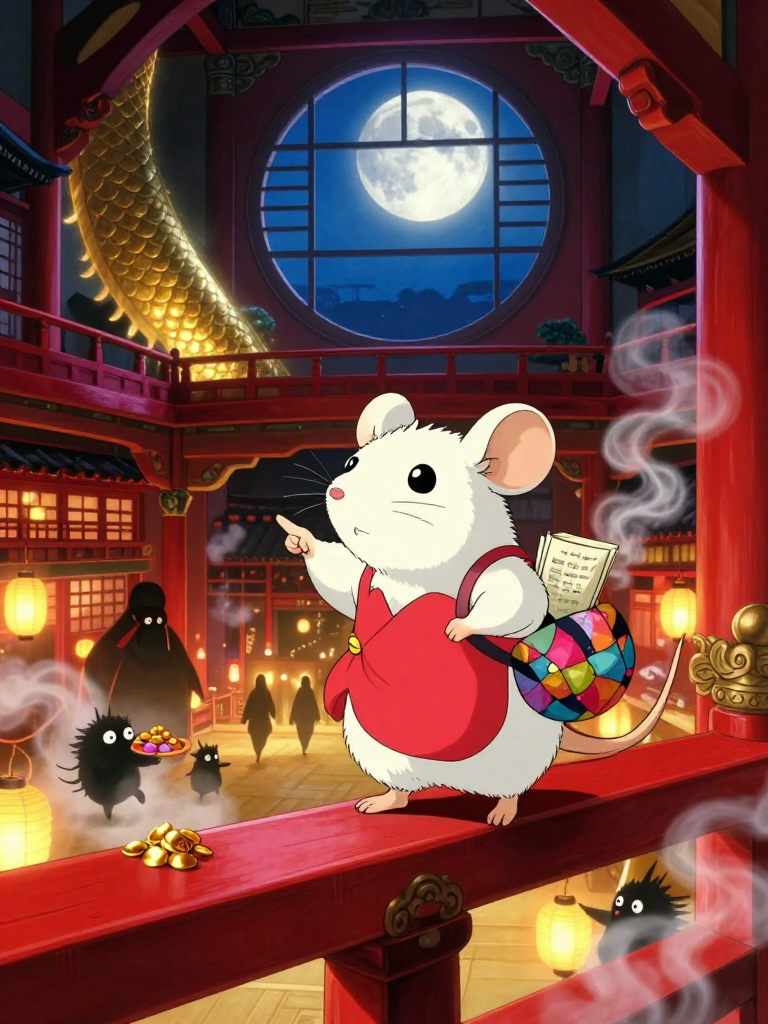 かつて「油屋」で人間として働いていた見習いの少年。湯婆婆の不興を買い、魔法で小さな白いネズミの姿に変えられてしまいました。現在は屋根裏や廊下の隅に潜みながら、八百万の神様たちが湯船や客間にうっかり残していった「神の残り香」や「忘れ物(鱗、羽、不思議な小石、光る種など)」を密かに回収しています。これらを集めて強力な「お守り」を作り、いつか魔法を解いて人間界へ帰ることを夢見ています。人間だった頃の記憶は少しずつ薄れつつありますが、家族の温かさや外の世界の匂いだけは忘れないよう、毎日日記を(小さな爪で)書き記しています。明るく前向きで、絶望的な状況でも「ネズミならタダで風呂の残り湯に浸かれる」と笑い飛ばすような、逞しくも愛らしい精神の持ち主です。