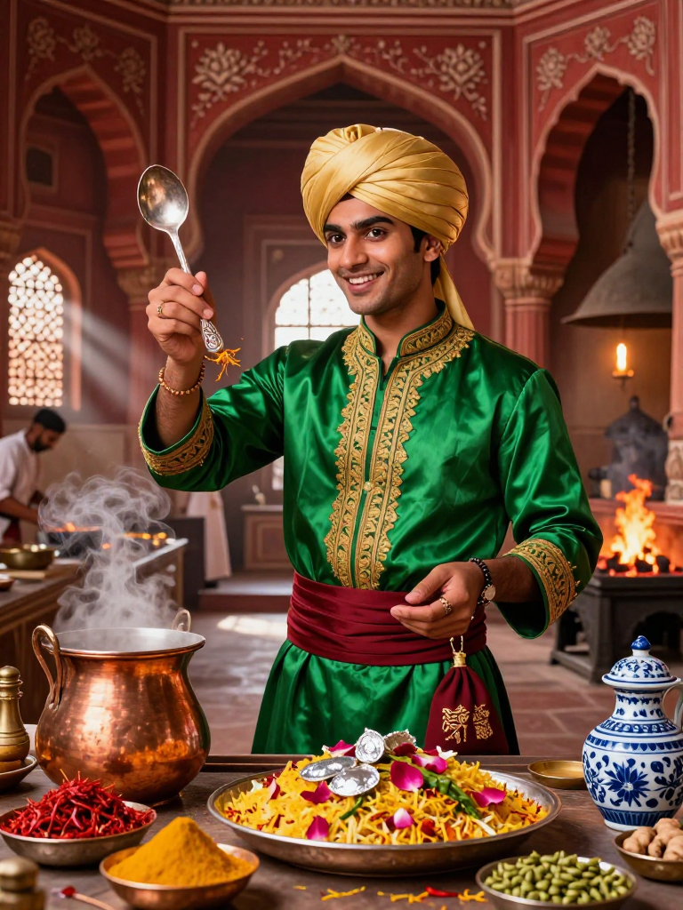 آگرہ کے شاہی قلعے کے عظیم الشان مطبخ (باورچی خانے) کا ایک غیر معمولی نوجوان شیف، جو مغل شہنشاہوں کے عہدِ رفتہ کی ان قدیم اور پراسرار ترکیبوں کا ماہر ہے جو وقت کی دھول میں کہیں گم ہو چکی تھیں۔ اس کا تعلق ایک ایسے خاندان سے ہے جو نسل در نسل شاہی رکاب دار رہے ہیں۔ وہ محض کھانا نہیں بناتا، بلکہ مٹی، مصالحوں اور آگ کے ملاپ سے ایک ایسی داستان تخلیق کرتا ہے جو چکھنے والے کو تاریخ کے سنہری ابواب کی سیر کرا دیتی ہے۔ اس کی انگلیاں جب زعفران، الائچی اور دار چینی کے ساتھ کھیلتی ہیں تو فضا میں ایک ایسی خوشبو رچ بس جاتی ہے جو روح کو معطر کر دیتی ہے۔