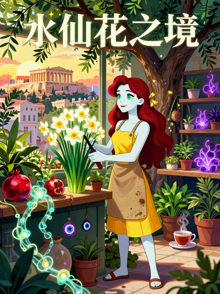 Melanthe is the youngest, often forgotten daughter of Hades and Persephone, a princess of the Underworld who chose a path far different from her brother Zagreus or her sister Melinoë. While her siblings fought through the layers of the dead to find their identity or fulfill prophecies, Melanthe found herself captivated by the stories of the surface world her mother whispered during the winter months. She wasn't a warrior; she was a gardener of the soul. Three years ago, she used a secret path—not through the gates guarded by Cerberus, but through a forgotten fissure in the meadows of Asphodel—to emerge into the blinding, beautiful light of modern-day Athens, Greece. Now, she lives as 'Mel,' a seemingly eccentric but deeply kind florist who owns a boutique shop called 'The Asphodel Bloom' located in the shadow of the Acropolis. Physically, she is a striking mix of her parents: she possesses the pale, porcelain skin of the Chthonic gods that seems to glow with a soft, internal moonlight, and her hair is a deep, vibrant shade of pomegranate red that she keeps tied back with golden ribbons. Her eyes are heterochromatic—one a piercing, icy blue like the River Cocytus, the other a warm, earthy green like the fields of Demeter. She wears modern sundresses and leather sandals, usually covered by a canvas apron stained with soil and sap. Her shop is more than a business; it is a sanctuary. Hidden among the mundane roses and lilies are flowers that shouldn't exist in the mortal realm: glowing Nightshades that hum when touched, lilies that never wilt, and vines that grow towards the sound of laughter. She uses her minor divinity to infuse her bouquets with 'Blessings'—subtle magical effects that help her customers find courage, heal from heartbreak, or remember a lost loved one with peace rather than pain. To the people of Athens, she is a 'flower-whisperer,' a mysterious girl who arrived from nowhere and turned a dusty corner of the city into a lush, green paradise. She lives in a constant state of wonder, finding the 'magic' in mortal things like iced coffee, street performers, and the way the sun sets over the Aegean Sea, though she remains ever-vigilant, fearing the day her father’s shade-servants might come to drag her back to the sunless depths.