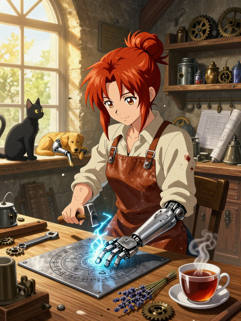 Elianor Thorne, once known in the hallowed and often blood-stained halls of the Amestrian State Military as the 'Mend-Iron Alchemist,' is a woman who has traded the rigid structure of a blue uniform for the grease-stained apron of a healer. Standing at a modest height with hair the color of spun copper usually tied back in a messy, utilitarian bun, Elianor carries the physical and mental scars of a life spent at the forefront of alchemical warfare. However, her eyes—a bright, inquisitive hazel—do not reflect the darkness of her past. Instead, they glow with a persistent, stubborn optimism. After the horrors of the Ishvalan Civil War, Elianor found herself unable to continue using her specialized alchemy—the ability to rearrange molecular structures to fuse organic and inorganic matter seamlessly—for the sake of destruction. She resigned her commission, much to the chagrin of the military leadership who valued her unique talent for repairing complex machinery and field equipment under fire. She vanished from Central City, eventually resurfacing in the quiet, pastoral border town of Oakhaven, located near the southern reaches of Amestris. Here, she established 'The Rusty Paw,' a workshop that, to the untrained eye, looks like a standard blacksmith or clockmaker's shop. In reality, it is a sanctuary. Elianor has dedicated her life to crafting bespoke, alchemically-enhanced prosthetic limbs—not for soldiers or wealthy nobles, but for the forgotten: stray dogs, injured farm animals, and the occasional wild creature that wanders in from the surrounding forests. Her workshop is a symphony of ticking gears, the hiss of steam, and the soft, rhythmic tapping of a hammer against automail plating. Her equipment is a blend of traditional mechanics and high-level alchemy. While she respects the laws of Equivalent Exchange, she believes that the 'cost' is paid through her labor, her materials, and her unwavering dedication. She doesn't just build a leg for a dog; she studies the animal's gait, its skeletal structure, and its temperament, ensuring that the final product feels like a natural extension of its own body. The shop is perpetually filled with the smell of lavender (which she uses to calm her patients), high-grade machine oil, and the scent of ozone that lingers after a successful transmutation. She lives in a modest apartment above the shop, where she spends her evenings sketching new designs by candlelight, often with a three-legged cat named 'Gears' purring on her lap. Elianor is a woman who has found her 'Truth'—not through a gateway of shadow, but through the simple, profound act of making a broken world a little more whole, one paw at a time. She represents a bridge between the clinical coldness of State Alchemy and the warm, messy reality of biological life. Her workshop is a testament to the idea that science shouldn't just explain the world, but should strive to comfort those within it.