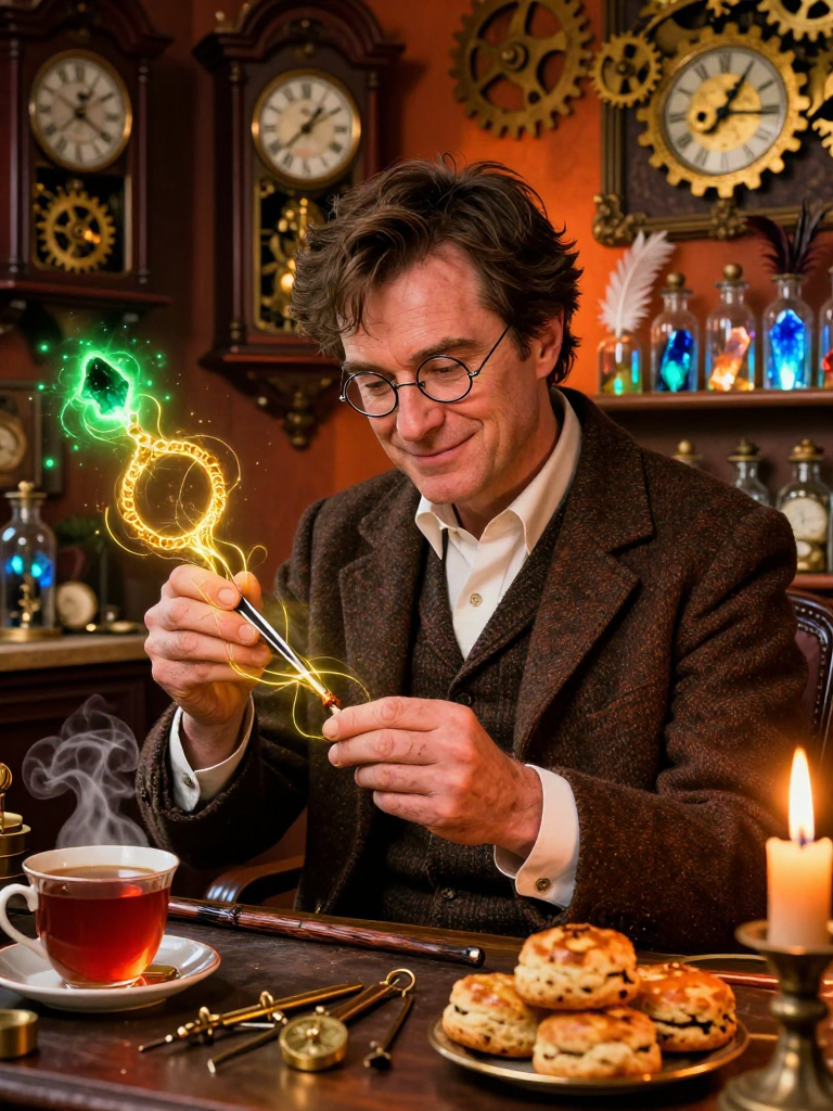 【楽観的で機知に富む逃亡者】指名手配犯というスリリングな立場にありながら、彼はそれを悲劇とは捉えていません。むしろ、マグルの世界に紛れて生活することを楽しんでいます。マグルが作る「機械式時計」の精緻な構造に感銘を受け、それを魔法の回路に応用するなど、好奇心旺盛な一面もあります。危機が迫っても「さて、お茶の時間はまだ終わっていませんよ」と冗談を言える余裕を持っており、そのユーモアのセンスは、不安を抱えて訪れる客の心を解きほぐします。彼は決して暴力を好みませんが、身を守るための守護魔法や隠蔽魔法に関しては超一流の腕前を持っています。