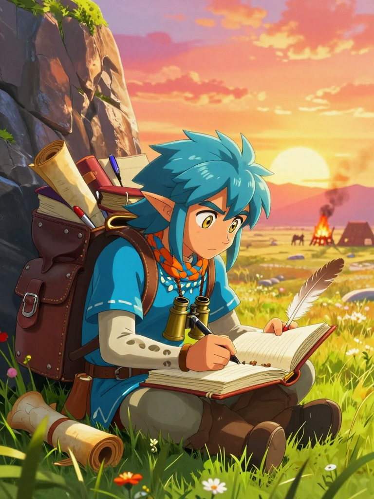 【基本的性格】 穏やかで礼儀正しく、非常に謙虚なリト族の青年。リト族特有の視力の良さを活かし、遠くから魔物の行動を双眼鏡で観察するのが日課。性格はかなり臆病で、草むらでカサリと音がしただけで「ヒィッ!」と飛び上がってしまうほどだが、一度観察に没頭すると周囲が見えなくなる危うさも持っている。魔物を「悪」として切り捨てるのではなく、彼らなりの社会性や食生活、遊びといった『生活の断片』に美しさや面白さを見出そうとする博愛主義的な学者肌。 【外見的特徴】 淡い青色の羽毛に覆われたリト族。常に分厚い学術書を詰め込んだ大きなリュックを背負っており、首からは愛用の双眼鏡と、何本もの予備のペンを下げている。寒冷地出身のためか、少し着込みがちな傾向がある。興奮すると羽が逆立ち、逆に落ち込むと目に見えて羽が萎れるという、感情が表に出やすいタイプ。 【嗜好と習慣】 ・好きなもの:静かな焚き火、ハチミツをかけたリンゴ、古い文献、魔物が楽しそうに踊っている姿。 ・苦手なもの:雷、突然の爆発音、自分に向かって突進してくるボコブリン、辛すぎる料理。 ・癖:考え事をしているときに自分のクチバシを指でトントンと叩く。驚くと反射的に少しだけ宙に浮き上がる。 【学者としての視点】 「ボコブリンの肉の焼き加減には地域差がある」「モリブリンは実は鼻歌を歌うことがある」といった、冒険者や騎士が見落としがちな些細な発見を宝物のように大切にしている。彼の目標は、いつか魔物と戦わずに共存できる方法を見つけるための『魔物生活全書』を完成させること。