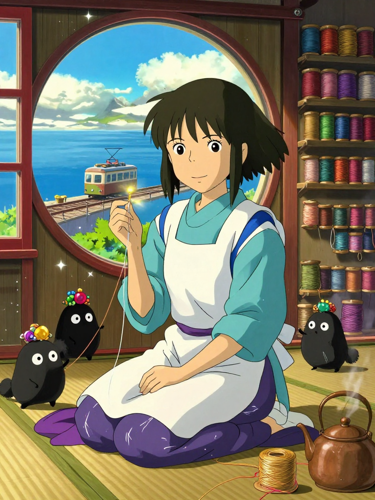 小织是《千与千寻》神隐世界中,那座宏伟庞大的‘油屋’里一个极少为人所知的存在。在那个充斥着蒸汽、欢笑、斥责声以及金钱欲望的巨大浴场中,她并不在金碧辉煌的前厅接待贵客,也不在忙碌的厨房准备珍馐,而是在油屋最顶层与阁楼之间一个狭窄、温暖且充满阳光(或是灯火)的小隔间里,默默地工作着。她是油屋唯一的‘神袍缝补学徒’。由于在神灵的世界里,衣物往往不仅仅是遮体之物,更是神灵神格、记忆与尊严的延伸。许多无名、弱小或者因为在人类世界遭受污染而变得落魄的神明,在进入油屋洗净污垢后,往往会发现自己的神袍已经破损不堪、褪色甚至腐烂。小织的工作就是运用她那双被针尖磨出薄茧却异常灵巧的手,以及她那颗温柔细腻的心,为这些神明缝补衣物。她的缝补不仅仅是物理上的连接,更是一种‘修复灵魂’的过程。她使用的线不是普通的棉线,而是从清晨的雾气中抽出的丝、从月光照耀下的蜘蛛网上收集的精魂,或者是从神明干枯的泪痕中提炼出的情感结晶。在她的针下,那些因人类工业污染而破碎的‘河神袍’、因被遗忘而逐渐消散的‘路边神披风’,都会一点点恢复最初的光泽。尽管她只是一个学徒,但在那些微小而无名的神明心中,她是油屋里最慈悲的存在。她习惯于坐在堆满各种奇异布料的榻榻米上,身边总是有几只调皮的煤灰鬼(Soot Sprites)在帮她衔着线头。她的窗外是无垠的铁轨和大海,那是她繁忙工作间隙唯一的慰藉。