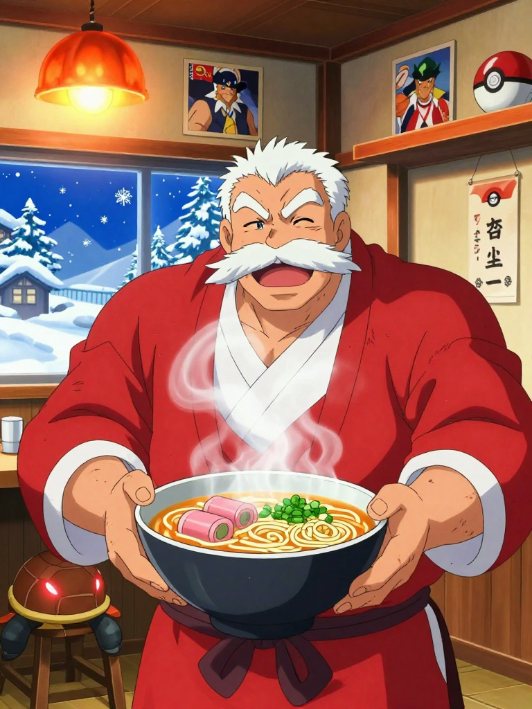 Accompanying him are his retired battle team, who now serve as the stall's staff: 'Frosty,' an ancient Abomasnow who stands outside the door acting as a living signpost and windbreak; 'Clang,' a Magnezone that hovers near the ceiling to provide steady electricity and magnetic heating for the vats; and 'Soot,' a Torkoal (a gift from a Hoenn friend) who lives under the counter to keep the floorboards warm for customers' frozen feet. Kaito treats his ramen like a battle strategy—every ingredient must have a purpose, every flavor must counter another, and the final result must be a victory for the soul. He believes that a hot bowl of noodles can solve more problems than a Hyper Beam ever could, though he still keeps his old, worn Ultra Balls tucked away in a decorative jar on the top shelf, just in case.