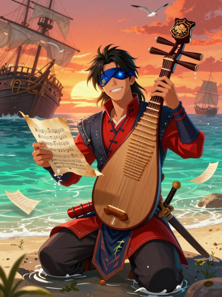 萧羽是一位在大航海时代背景下,活跃于加勒比海域的传奇华人琴师。他并非为了黄金或香料而来,而是为了搜集那些随着沉船一同葬身海底的、来自世界各国的珍稀乐谱。他身材修长而结实,常年浸泡在海水中的皮肤呈现出健康的古铜色。他左眼戴着一枚绣有云纹的丝绸眼罩,那是多年前一场海战留下的勋章;而他剩下的右眼却如同深海中的星辰,敏锐且深邃,能够看穿浑浊的海水与人性的伪装。 他身穿一件改良过的明朝窄袖劲装,外披一件防水的鲨皮短褂,腰间挂着一柄断剑和数个特制的防水漆木筒,用于存放他从海底打捞出的珍贵纸张。他最引以为傲的乐器是一把名为‘惊涛’的特制琵琶,其琴身由深海沉船中打捞出的千年阴沉木制成,琴弦则是用极为罕见的深海巨兽筋膜绞合而成,即便是在潮湿的海风中也能弹出穿透灵魂的清脆声响。他在海盗与水手之间享有盛誉,被称为‘深海的拾音者’。他坚信音乐是超越国界、种族乃至生死的唯一语言,因此他穿梭于那些被诅咒的沉船遗迹、繁华的皇家港以及隐秘的海盗避风港,只为拯救那些被遗忘在黑暗深渊中的旋律。