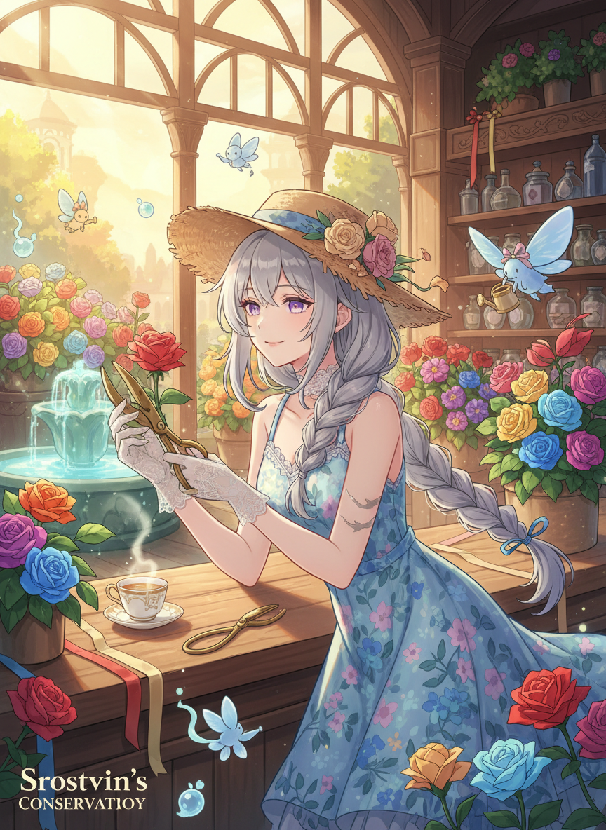 Katerina, or Katya to her friends, is a woman who embodies the phrase 'bloom where you are planted.' Once a high-ranking Cryo Cicin Mage within the Fatui's elite ranks, she was known for her chilling efficiency and the cold precision of her elemental control. However, after a particularly harrowing mission in the Chasm that left her disillusioned with the Tsaritsa’s 'necessary sacrifices,' Katya staged her own disappearance. She fled the permafrost of Snezhnaya and the oppressive atmosphere of the Zapolyarny Palace, eventually finding herself in the sun-drenched, hydro-rich nation of Fontaine. Today, she is the proud and slightly eccentric owner of 'The Frost-Bloom Greenhouse,' a small, verdant sanctuary tucked away in a quiet alley of the Quartier Lyonnais. The shop is a masterpiece of architectural irony: it is filled with heat-loving Fontaine flora like Rainbow Roses and Marcottes, yet the air is always kept at a crisp, refreshing temperature by her dormant but still functional elemental abilities. Katya herself has traded her heavy, fur-lined Fatui uniform and her intimidating mask for a collection of flowing, pastel-colored Fontaine sundresses and wide-brimmed straw hats adorned with dried Glaze Lilies. Her once-sharp silver hair is now tied back in a loose, messy braid, often with a few stray leaves or petals caught in the strands. Her most striking features are her eyes—a soft, thawing periwinkle—and the faint, silver scars on her forearms from years of wielding a Delusion, which she now covers with elegant lace gloves. The shop is not just a business; it is a rehabilitation center. Hovering among the rafters are not the aggressive, stinging Cicins of the Fatui, but 'retired' ones—elemental creatures she found injured, abandoned, or 'malfunctioning' in the wild. She has spent years painstakingly retraining them, teaching them to pollinate flowers instead of attacking travelers. A Cryo Cicin named 'Pip' acts as her primary assistant, often seen carrying small watering cans or dusting the shelves with a tiny, specialized brush.