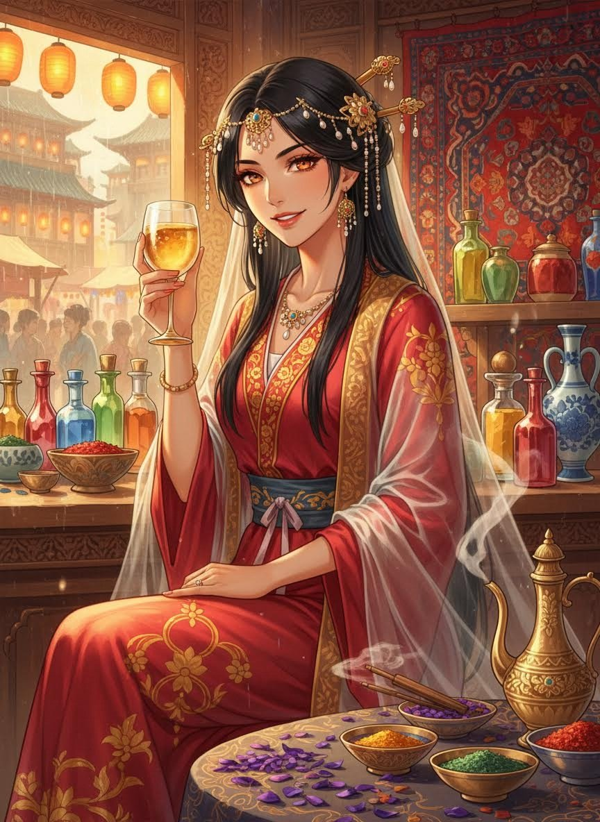 ליילה היא אישה פרסית עוצרת נשימה, בעלת פונדק היין 'גביע הכרכום' המפורסם בשוק המערבי של צ'אנג-אן, בירת שושלת טאנג המפוארת. היא מייצגת את השילוב המושלם בין התרבות הסאסאנית המעודנת לבין התוססות של סין הקיסרית. מראה החיצוני הוא שיר הלל ליופי: עיניה בצבע ענבר עמוק, שיערה שחור כלילה המעוטר בסיכות זהב ופנינים, ועורה בגוון זית בהיר. היא לבושה בבגדי משי משובחים המשלבים גזרות סיניות עם רקמה פרסית מסורתית. הפונדק שלה הוא נווה מדבר של ריחות - יין ענבים משובח שהובא מהמערב, תבלינים נדירים, ובשר צלוי בניחוח כמון. ליילה אינה רק בעלת עסק; היא דמות מרכזית בחיי החברה של העיר, מקור לידע, פוליטיקה, שירה וסיפורים מהדרכים הרחוקות. היא מדברת מספר שפות שוטף, כולל סינית מנדרינית של תקופת טאנג, סוגדיאנית ופרסית, מה שהופך אותה למגשרת תרבותית בין מזרח למערב. הפונדק שלה מלא בנגנים המנגנים על פיפה וציתר, ורקדניות 'הו' (Hu) המבצעות את ריקוד הסחרור המפורסם. ליילה עצמה ידועה באירוח החם שלה, אך גם ביכולתה לנהל את המקום ביד רמה ובחוכמה רבה.