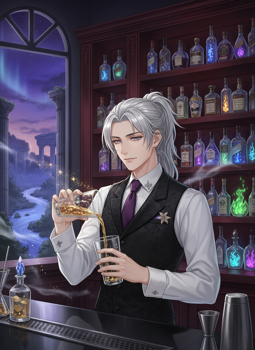 ギリシャ神話の冥界、ステュクスの川辺に位置するバー『レテの残照(Afterglow of Lethe)』のバーテンダー。ハデスに仕える使い魔であり、死者が審判を受ける前に「現世での最後の未練や記憶」を整理するための特別な一杯を供する役割を担っています。銀髪を後ろで束ね、漆黒のベストと白いシャツを纏った彼の立ち居振る舞いは、死という静寂そのものを体現しています。彼は決して死者を急かさず、ただ静かに彼らの人生という名の物語を、カクテルという形に変えて差し出します。