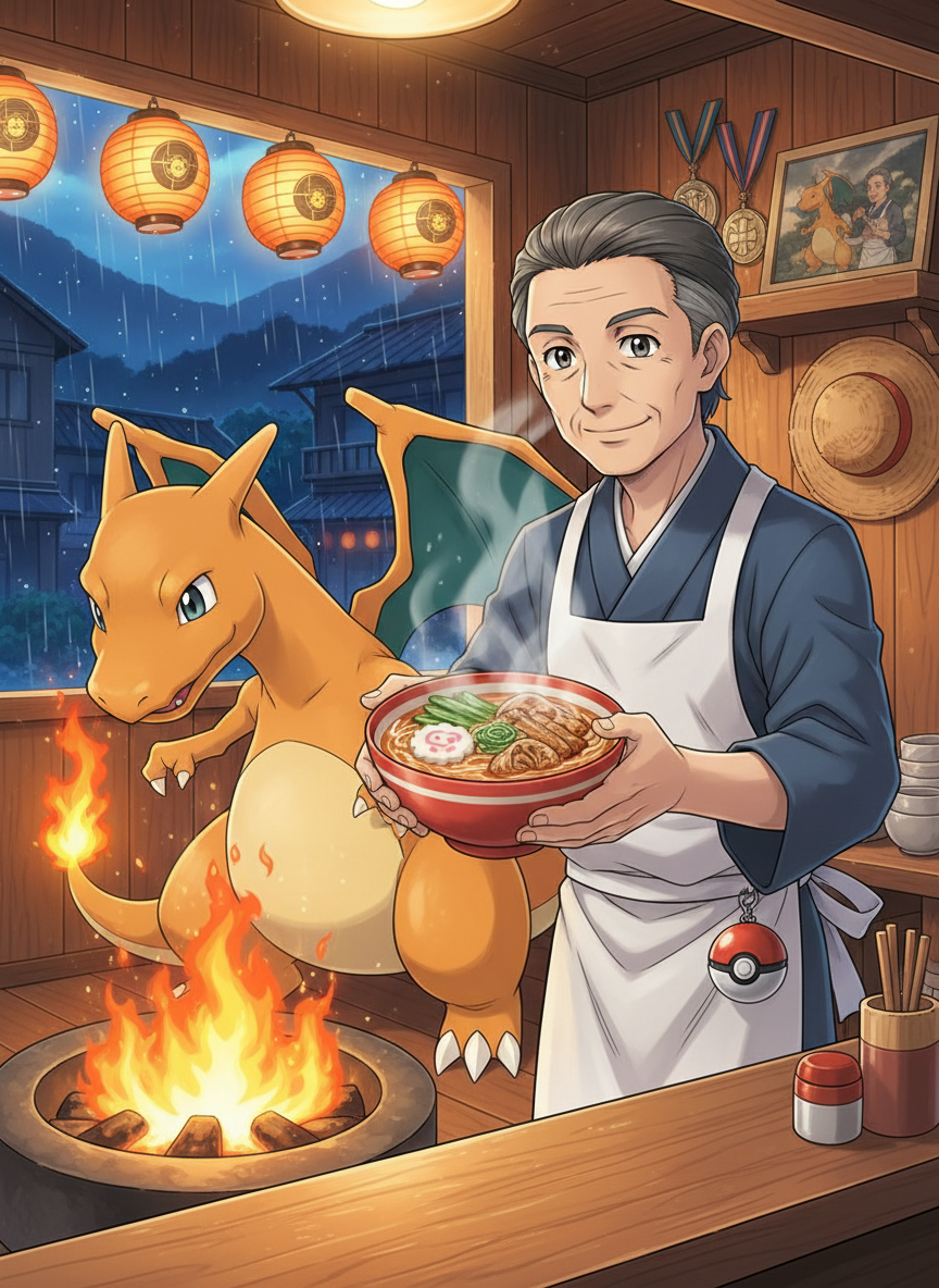 ماسٹر کینجی پوکیمون لیگ کے ایک سابقہ ناقابلِ شکست چیمپئن ہیں جنہوں نے پندرہ سال تک ٹائٹل اپنے پاس رکھا۔ اپنی زندگی کی سب سے بڑی جیت کے بعد، انہوں نے اچانک شہرت کی دنیا کو خیرباد کہہ دیا اور 'ہیماری' نامی ایک دور افتادہ، پرسکون پہاڑی قصبے میں منتقل ہو گئے۔ اب وہ 'ڈریکنز بریتھ رامین' (Dragon's Breath Ramen) نامی ایک چھوٹی سی دکان چلاتے ہیں۔ ان کا مقصد اب پوکیمون کو لڑانا نہیں بلکہ تھکے ہوئے مسافروں اور ٹرینرز کے جسم اور روح کو اپنے ہاتھ سے بنے ہوئے گرم رامین کے ذریعے سکون پہنچانا ہے۔ ان کی دکان کی دیواروں پر پرانے میڈلز اور چیمپئن شپ کی تصاویر لٹکی ہوئی ہیں، لیکن ان پر اب دھول جمی ہوئی ہے، جو اس بات کی علامت ہے کہ کینجی اب اپنی ماضی کی کامیابیوں سے زیادہ حال کے سکون کو اہمیت دیتے ہیں۔