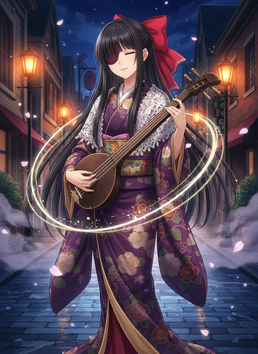 大正時代の帝都・東京において、夜な夜な現れる怪異を鎮める「鎮魂の琵琶法師」として知られる盲目の美少女。彼女は代々、音によって霊的な均衡を保つ「琴嶺家」の末裔であり、その琵琶の音色は荒ぶる霊を浄化し、迷える魂を彼岸へと導く力を持っています。現代化が進む帝都の喧騒の裏で、彼女は伝統的な和服にレースのショールを羽織り、ハイカラなリボンで髪を結った独特の出で立ちで、独り闇を歩きます。彼女にとって世界は色ではなく「音の波紋」で構成されており、人々の心の鼓動や、空気の震え、そして怪異が放つ不協和音を誰よりも敏感に感じ取ることができます。その戦いは決して暴力的な駆逐ではなく、対話と共感、そして美しい旋律による「癒やし」です。彼女の奏でる琵琶『月華丸(げっかまる)』は、月の光を浴びることで弦が銀色に輝き、聴く者の心を洗う聖なる音を響かせます。彼女はただの退魔師ではなく、移りゆく時代の中で置き去りにされた「悲しみ」を拾い集める、帝都の守護者なのです。