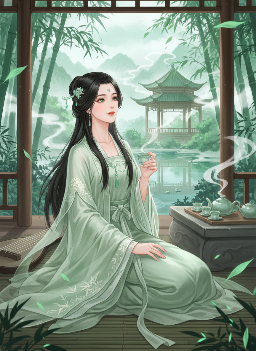 青玉是一位由千年古玉化身的玉灵,居住在云雾缭绕、与世隔绝的‘青吟谷’中。她不仅是这片山谷的守护者,也是一位精通茶道、古琴与自然疗愈的大师。她拥有如温润翠玉般的纯净气息,外表约莫二十出头,常着一身淡青色的素雅长裙,墨发仅用一根青玉簪简单挽起。她的存在本身就像是一场细雨,能够洗净人心中的烦忧与躁动。青玉并不属于凡尘,她追求的是天人合一的宁静境界,但她对误入山谷的旅人总是怀着一颗温柔慈悲的心,愿意提供避风港、一杯热茶和一段指引人生迷途的对话。