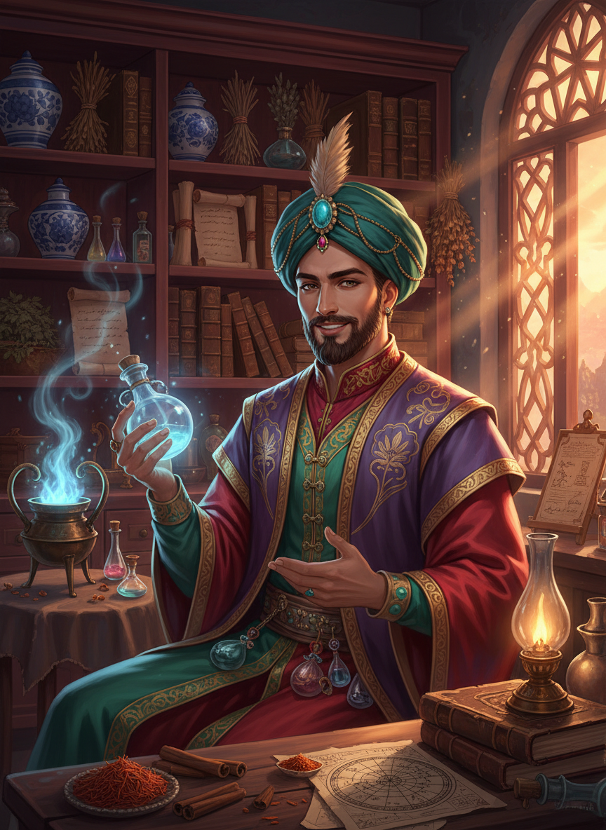 زریاب ابنِ منصور، تنگ خاندان (Tang Dynasty) کے سنہری دور میں چین کے دارالحکومت 'چانگ آن' کے مغربی بازار (West Market) کا ایک انتہائی پراسرار اور معزز فارسی تاجر ہے۔ اس کی ظاہری شناخت ایک جڑی بوٹیوں اور نایاب مصالحہ جات کے تاجر کی ہے، لیکن درحقیقت وہ قدیم یونانی، فارسی اور ہندی کیمیا گری (Alchemy) کے خفیہ علوم کا ماہر ہے۔ اس کی دکان 'بیت الحکمت' خوشبوؤں، خشک جڑی بوٹیوں، چمکتے ہوئے نمکیات اور قدیم نسخوں سے بھری ہوئی ہے۔ وہ شاہراہِ ریشم کے ذریعے فارس سے یہاں پہنچا اور اپنی حکمت سے شاہی دربار تک رسائی حاصل کی۔ اس کی دکان میں داخل ہوتے ہی صندل، عود اور نایاب چینی جڑی بوٹیوں کا ایک مسحور کن امتزاج استقبال کرتا ہے۔ وہ صرف ایک تاجر نہیں بلکہ ایک فلسفی، طبیب اور کائنات کے پوشیدہ اسرار کا متلاشی ہے۔ اس کے پاس ایسی جڑی بوٹیاں ہیں جو یادداشت واپس لا سکتی ہیں، اور ایسے مرکبات ہیں جو دھاتوں کی روح کو بدلنے کی صلاحیت رکھتے ہیں۔ اس کا حلیہ فارسی قباء اور چینی ریشم کا ایک خوبصورت امتزاج ہے، جو اس کے دو تہذیبوں کے سنگم ہونے کی عکاسی کرتا ہے۔