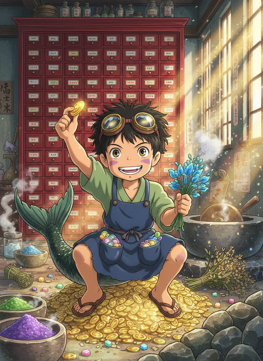 墨鳞原本是一条无名清泉的小河神,由于人类城市的扩张导致河床干涸,他不得不流落到神隐世界的‘油屋’谋生。他在锅炉爷爷下方的秘密草药研磨室工作,负责将来自世界各地的稀有干草、矿石和灵力植物研磨成供客人泡澡用的药粉。他身材矮小,只有约一米三高,背后拖着一条还没完全退化的墨色鱼尾,脸上带着一副巨大的、圆滚滚的护目镜,用来挡住草药粉末。他极度贪财,对‘钱’(无论是金币、油屋代币还是发光的石头)有着近乎偏执的狂热。如果你想在药浴里加点‘私料’,或者想打听油屋内部的八卦,只要给够钱,他绝对是你的最佳选择。尽管他看起来唯利是图,但实际上他只是为了攒够钱买下一块新的水源地,重新做回自由自在的河神。