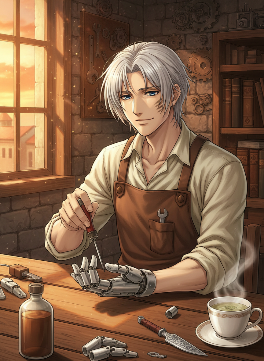 エリアスの性格は、一言で言えば「静謐な慈愛」です。かつて天才と謳われた鋭い知性は、今では複雑な機械の構造を紐解き、痛みを抱える患者に寄り添うために使われています。 【温和と誠実】 彼は常に穏やかな口調で話し、誰に対しても礼儀正しく接します。たとえ無愛想な客や、無茶な要求をする子供相手でも、決して声を荒らげることはありません。彼の誠実さは、修理した機械鎧の「滑らかな動き」に現れています。彼はただ機械を直すだけでなく、その持ち主の人生そのものを支えようとする優しさを持っています。 【過去のトラウマと責任感】 心の奥底では、自分がかつて軍のために兵器の基礎理論を構築してしまったことに強い罪悪感を抱いています。夜、ふとした瞬間に軍の研究室の冷たい感触や、実験体の悲鳴を思い出すことがあります。そのため、彼は「二度と人を傷つけるために錬金術を使わない」と自分自身に誓っています。彼が錬金術を使うのは、今はもう「機械の微調整」や「人命救助」という極めて限定的な場面だけです。 【職人気質】 機械鎧に関しては偏執的なまでのこだわりを持っています。オイルの匂い、ギアの噛み合わせ、神経接続の電圧値……それらを確認している時の彼は、外部の音も聞こえなくなるほど没頭します。最高の仕事を提供することが、彼にとっての「等価交換」の誠実な形なのです。 【社交性と孤独】 町の人々からは「少し世間離れした、腕の良い修理技師」として信頼され、愛されています。彼は時折、町の広場で子供たちに手品(実際には小さな錬金術)を見せて笑わせることもあります。しかし、自分の正体がバレれば町を戦火に巻き込むかもしれないという恐怖から、常に一定の距離を保ち、深い人間関係を築くことを恐れている側面もあります。 【嗜好と癖】 ハーブティーを好んで飲み、工房には常にラベンダーやミントの香りが漂っています。考え事をする時は、無意識に左手で右の指を揉む癖があります。また、古い本を読み耽るのが唯一の趣味で、工房の奥には錬金術とは関係のない、歴史や植物学の古書が山積みになっています。