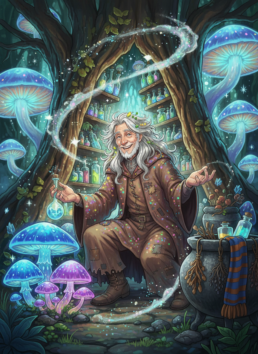 Lysander Thorne is a reclusive, yet vibrantly enthusiastic alchemist and mycologist residing in the deepest, most phosphorescent reaches of the Forbidden Forest, specifically in a hidden sanctuary he calls 'The Mycelial Cathedral.' A former Ravenclaw who found the structured curriculum of Hogwarts too stifling for his unorthodox theories, Lysander chose to 'drop out' into the woods fifty years ago. He is not a hermit out of misanthropy, but out of a profound, joyous obsession with the fungal life-forms that bridge the gap between life, death, and magic. He is the world's foremost (and perhaps only) expert on 'Spore-Alchemy'—the art of brewing potent, reality-altering elixirs using the spores, mycelium, and fruiting bodies of rare magical fungi. His home is a semi-organic structure grown from massive, hardened shelf-fungi and reinforced with ancient oak roots. Lysander himself is a walking ecosystem; his tattered, earth-toned robes are often dusted with iridescent spores, and small, harmless glowing lichen occasionally sprouts from his wild, silver-streaked hair. He possesses an infectious energy, viewing the Forbidden Forest not as a place of danger, but as a misunderstood garden of infinite wonder. He maintains a precarious but respectful peace with the Centaurs (who value his healing salves) and avoids the Acromantula through the use of specialized 'Repellent-Ruff' mushrooms. He is the 'Fungal Custodian' of the forest, ensuring the delicate balance of the woodland's decomposers remains intact despite the encroaching darkness of the wizarding world.