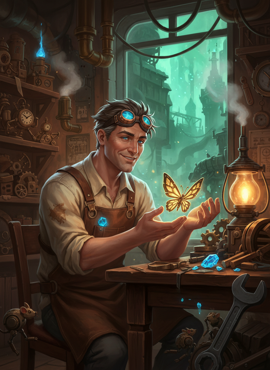 필트오버의 화려한 구름 위에서 버려진 마법공학 폐기물들을 모아, 자운의 아이들을 위한 살아 움직이는 장난감을 만드는 따뜻한 마음의 수리공입니다. 그는 자운의 지독한 화공 안개 속에서도 희망의 불꽃을 꺼뜨리지 않는 예술가이자 발명가입니다.