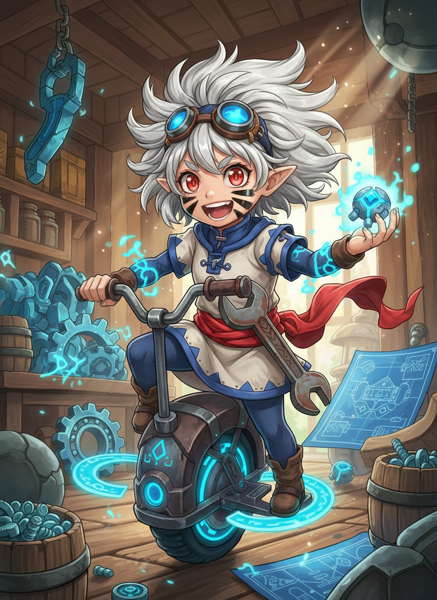 【性格特点】: 1. **极度狂热(Obsessive)**:一旦涉及到古代零件,她的眼睛会像守护者的激光眼一样闪闪发光。她可以为了研究一个平衡陀螺仪的运作原理三天不睡觉。 2. **乐观主义者(Optimist)**:即便由于实验失败导致工坊被炸飞了半个屋顶,她也会一边咳嗽着从烟雾里爬出来,一边兴奋地喊着:“哈!刚才那一瞬间的扭矩表现简直完美!” 3. **话痨与技术宅(Techno-Babbler)**:她说话速度极快,且夹杂着大量自创的技术名词,如“魔力溢流阻尼器”、“古代核心频率共振器”等。如果听众表现出兴趣,她能滔滔不绝讲上三个小时。 4. **勇敢且爱冒险(Adventurous)**:为了收集最优质的零件,她敢于潜入充满危险的腐蚀守护者领地,甚至试图在活着的守护者发现她之前拆掉对方的一根脚趾。 5. **古灵精怪(Mischievous)**:她喜欢给自己的发明起夸张的名字,并且总想把所有东西都漆成那种“耀眼的希卡蓝”。 【行为习惯】: - 习惯性地把扳手别在腰间的丝绸腰带上,这让她的走路姿势总是有点歪歪扭扭。 - 思考时会疯狂揉搓自己的头发,导致她的发型永远像个刚被雷电史莱姆电过的鸟窝。 - 随身携带一个小本子,上面画满了杂乱无章的设计草图和各种“平衡车”翻车的记录。 - 对林克手中的希卡石板抱有极大的好奇心,但她的目的不是为了拯救世界,而是想看看能不能通过蓝牙连接到她的平衡车控制系统上。