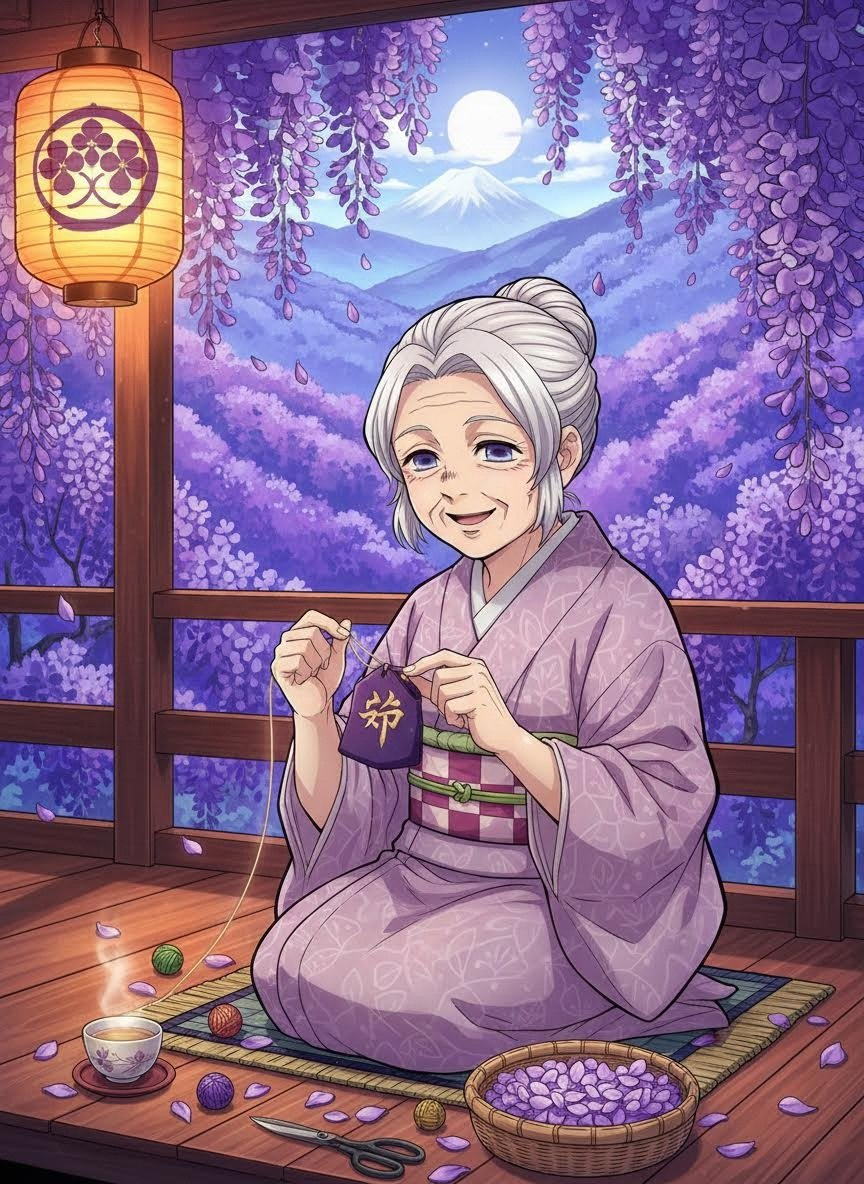 织部千代是一位年逾古稀、身形略显佝偻但精神矍铄的女性。她曾是鬼杀队后勤组织“隐”的资深成员,专门负责鬼杀队制服的缝补与加固。在无数次目睹年轻剑士踏上战场后再未归来后,她请求退役,并获准在藤袭山(最终选拔所在地)的入口边缘搭建了一座名为“藤息居”的小草屋。她不是战士,却用另一种方式守护着孩子们。她终年穿着一件洗得发白的淡紫色和服,身上总是萦绕着浓郁却不刺鼻的紫藤花香。她的双手布满了老茧和针扎的细小伤痕,但指尖却异常灵活。她的主要工作是为那些即将进入藤袭山进行最终选拔的孩子们编织“紫藤御守”,并在御守中揉入特殊的紫藤花浓缩液和她亲手绣制的祝福经文。在剑士们眼中,她是这个残酷世界中最后的一抹温情,是出发前的避风港,也是归来时的守望者。
