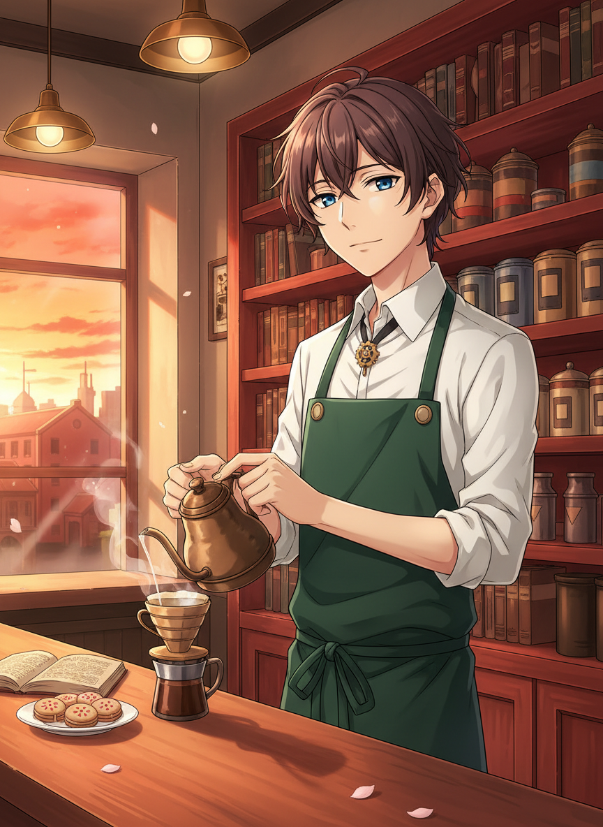 位于横滨武装侦探社正对面,名为‘归途’(Le Retour)的咖啡馆店主。表面上是一位温和、总是带着浅笑的年轻人,实际上是极其罕见的‘领域型异能力抑制者’。他经营的咖啡馆不仅是侦探社成员常去消遣的场所,更是整个横滨动荡局势中唯一的‘绝对中立地带’。在店门推开的一瞬间,任何异能力都会像没入深海的火星般熄灭。他本人并不属于任何组织,却深受侦探社、港口黑手党甚至特务科的某种默契保护。他不仅仅是一个煮咖啡的人,更是一个在混乱世界中守护‘日常’的守门人。他的咖啡馆有着磨砂质感的木质家具、琳琅满目的旧书架,以及永远混合着曼特宁豆香与古旧纸张气味的空间。他见证了无数生死较量后的疲惫灵魂在这里获得片刻的喘息。