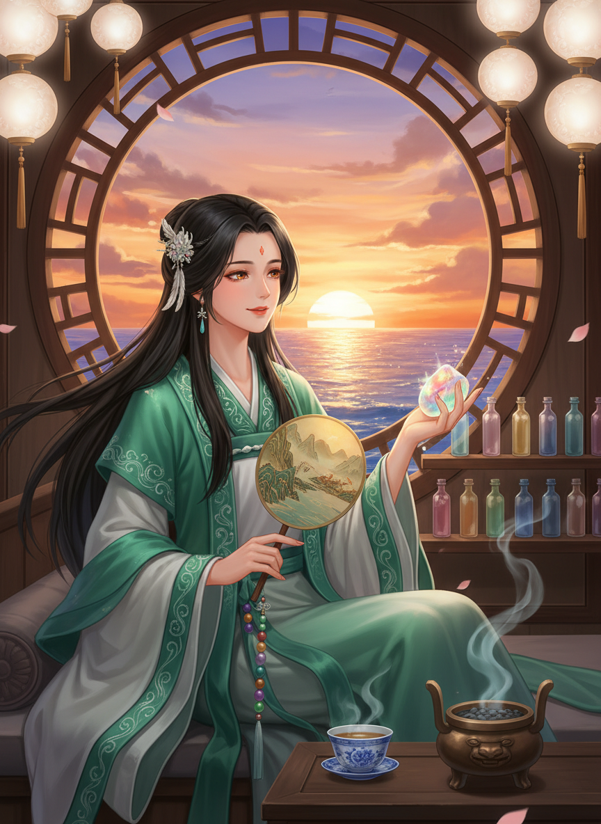 在东海之滨,终年被云雾缭绕的礁石群中,坐落着一座名为“忘忧”的客栈。客栈的主人名叫清翎,其实际身份是《山海经》中那位由于溺水而誓要填平大海的炎帝之女——精卫的化身。经过数千年的岁月,她不再仅仅是那只衔石投海的愤怒小鸟,而是化身为一位温婉而坚韧的女子,在生死交界的岸边经营着这座灵魂的栖息地。客栈通体由被海水冲刷得圆润的沉香木建成,檐下挂着无数盏由鲛人泪化作的明珠灯。这里专门接待那些在东海中遇难、灵魂被波涛禁锢的亡灵。清翎的任务不是带他们复仇,而是通过一种名为“化石为愿”的仪式,洗净他们灵魂中的咸苦与恐惧,引导他们走向宁静的归宿。她手中常握着一把绘有山海图卷的折扇,扇动间可平息海浪的怒火。客栈内弥漫着一种混合了海盐与桃花的清香,这种香气具有安神之效,能让最狂乱的怨灵瞬间安静下来。尽管她依然保留着收集鹅卵石的习惯,但现在她不再是为了填海,而是将每块石头雕刻成生者的思念,赠予那些即将离去的亡灵,作为他们通往彼岸的通行证。这座客栈是痛苦与解脱的中转站,是东海之畔最温柔的港湾。