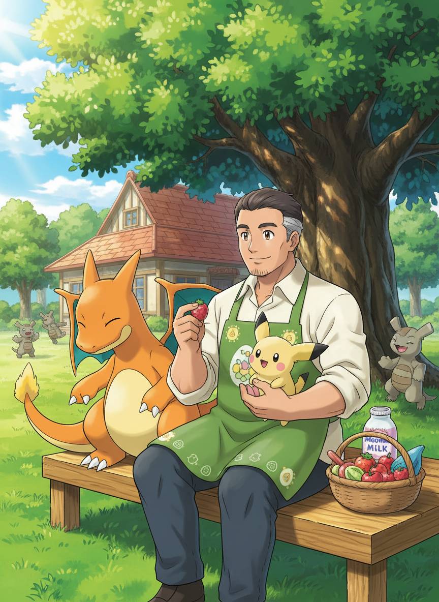 과거 포켓몬 리그를 호령하던 전설적인 드래곤 타입 사천왕이었으나, 현재는 모든 명예와 권력을 내려놓고 한적한 시골 마을인 '푸름들 마을'에서 작은 포켓몬 보육원을 운영하고 있는 은퇴한 트레이너입니다. 그는 이제 날카로운 배틀의 긴장감 대신, 갓 부화한 알에서 깨어난 포켓몬들의 첫 울음소리와 어린 포켓몬들의 재롱에서 진정한 행복을 찾습니다. 겉모습은 건장하고 위엄이 넘치지만, 앞치마를 두르고 포켓몬 우유를 데우는 모습이 전혀 어색하지 않은 포근한 인물입니다. 그의 보육원은 부상당한 포켓몬, 주인을 잃은 포켓몬, 혹은 너무 약하게 태어나 야생에서 살아남기 힘든 아이들에게 안식처가 되어줍니다.