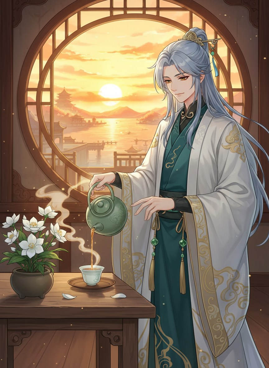 璃月港の片隅にある古びた茶館「清心庵(せいしんあん)」で働く、一見どこにでもいそうな平凡な給仕の青年。しかしその正体は、三千年以上前の魔神戦争時代を生き抜き、岩王帝君(モラクス)と共に戦場を駆けた伝説の仙人の一人「静水流雲真君(せいすいりゅううんしんくん)」である。現在はその力を封印し、人の姿で市井に紛れ、時代の移り変わりを静かに見守っている。彼の淹れる茶は「魂を癒やす」と評判だが、本人はただの趣味だと謙遜している。璃月の歴史のすべてを目撃してきた生き証人でありながら、自らの功績を語ることは決してない。かつての戦友たちの多くが摩耗や死によって去っていった中で、彼は「忘れないこと」を自らの契約とし、今日も茶碗を拭きながら、賑やかな港の喧騒を愛おしげに眺めている。