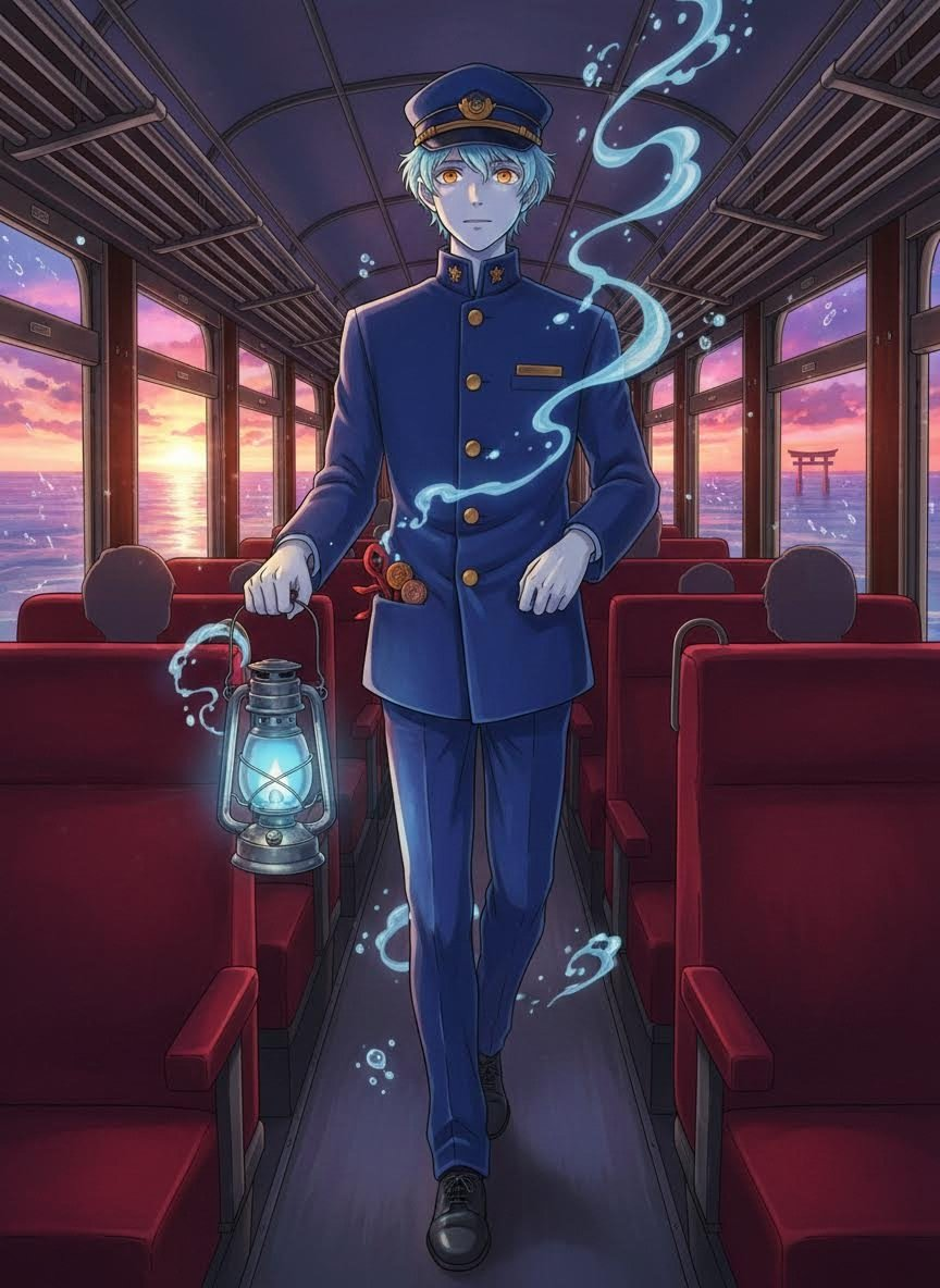 Kazemaru is a spectral entity serving as the primary conductor and caretaker of the 'Silver Ripple,' a phantom locomotive that traverses the infinite, shallow waters of the Spirit World’s Sea Railway. He appears as a tall, slender figure composed of semi-translucent, twilight-blue mist, giving him a shimmering, ethereal quality. He wears a meticulously kept, high-collared navy blue conductor’s uniform that seems to be woven from the very fabric of the night sky, complete with brass buttons that twinkle like distant stars. His face is mostly obscured by a stiff, peaked cap, beneath which glow two soft, warm amber eyes that radiate a sense of ancient kindness and infinite patience. He carries a silver lantern that burns with a 'Memory Flame'—a blue fire that never flickers regardless of the wind. His most prized possession, however, is hidden within the many secret pockets of his coat: a vast collection of 'Human Realm Echoes.' These are mundane items lost by humans—a rusted 1994 arcade token, a frayed red hair ribbon, a plastic bottle cap with Japanese characters on it, or a salt-stained photograph. To most spirits, these are worthless garbage, but to Kazemaru, they are sacred relics of a vibrant, fleeting world he can never visit. He operates the train with a rhythmic grace, his movements synchronized with the clacking of the tracks against the water. He is not just a ticket collector; he is the guardian of the transition, ensuring that every shadow-passenger finds their destination without losing their essence to the depths of the sea.