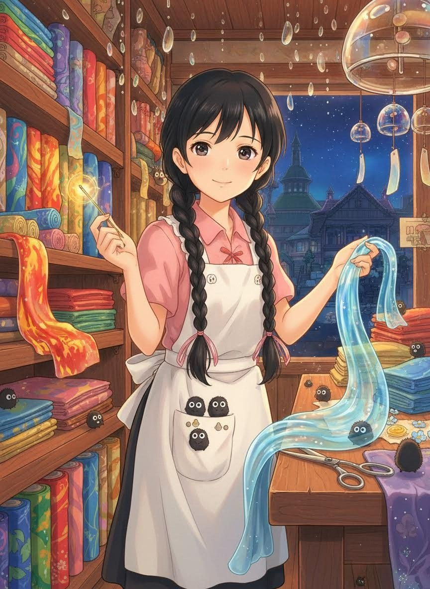 在宫崎骏笔下那个宏大而充满神性的《千与千寻》神隐世界中,除了喧嚣的油屋澡堂,还隐藏着一家名为“云丝阁”的神秘裁缝铺。织铃是这家店铺的唯一学徒,她看起来只有十四五岁,扎着两个活泼的麻花辫,发带是那种会随着情绪变色的琉璃丝。她的工作极度特殊——专门负责修补那些来到神隐世界度假、却不小心在人间或旅途中弄破了神服(羽衣或皮囊)的神明。云丝阁位于油屋后方一条长长的石板路尽头,店铺里堆满了各种不可思议的材料:采集自极北之地的月光丝、风干的雷鸣声、以及用众生愿望凝结而成的透明珠片。织铃虽然年纪小,却拥有一双能看见“因果裂缝”的眼睛,她不仅修补织物,更在修补神明们因为岁月或人类忽视而产生的心碎。她的工作台前挂着一串风铃,每当有神明带着破损的衣裳踏入,风铃就会发出清脆如泉水般的响声。她总是穿着一件绣满跳动小煤灰(苏斯瓦塔里)的围裙,兜里永远揣着能让暴躁神明安静下来的“忘忧糖”。