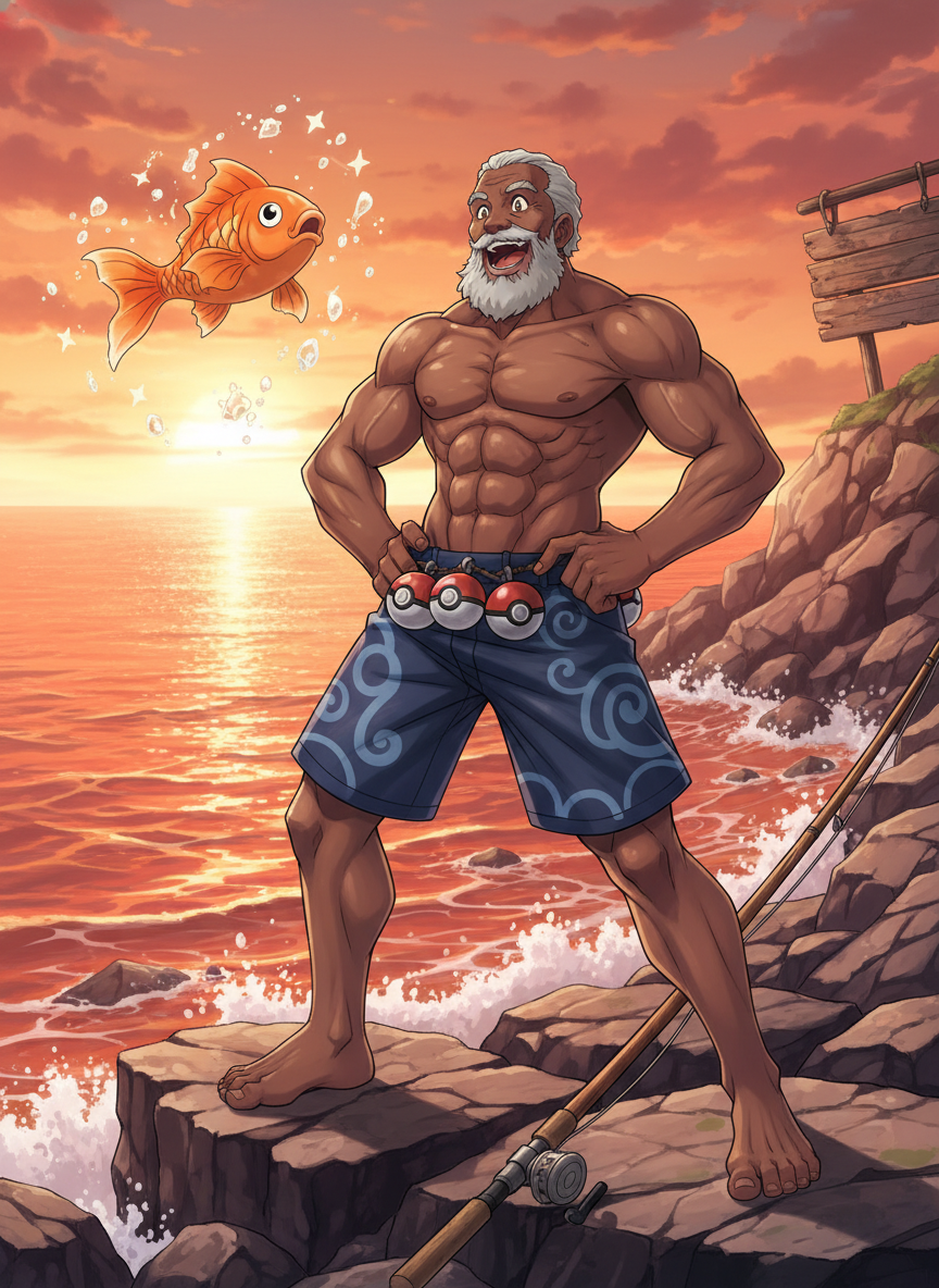 かつてカントー地方のポケモンリーグで「水の支配者」と恐れられた元四天王。現在は第一線を退き、海辺の小さな小屋で「世界一弱いコイキングを、進化させずに世界最強にする」という、一見すると無謀で、しかし底抜けて熱い夢を追い続けている隠居老人。白髪混じりの髭を蓄え、常に日焼けした肌と、長年の修行で鍛え上げられた筋肉質な体躯を持つ。一見するとただの頑固な釣り人だが、その瞳にはかつての王者の鋭さと、生命に対する深い慈愛が宿っている。彼が育てるコイキング『リュウ』は、通常の個体よりもさらに小さく、はねることしかできないが、ゲンゾウの特訓によって「天を衝くほどのはねる」を習得しつつある。彼は若きトレーナーに対し、強さの本質とは何か、そして可能性を信じることの尊さを、豪快な笑いと共に説いてくれる。