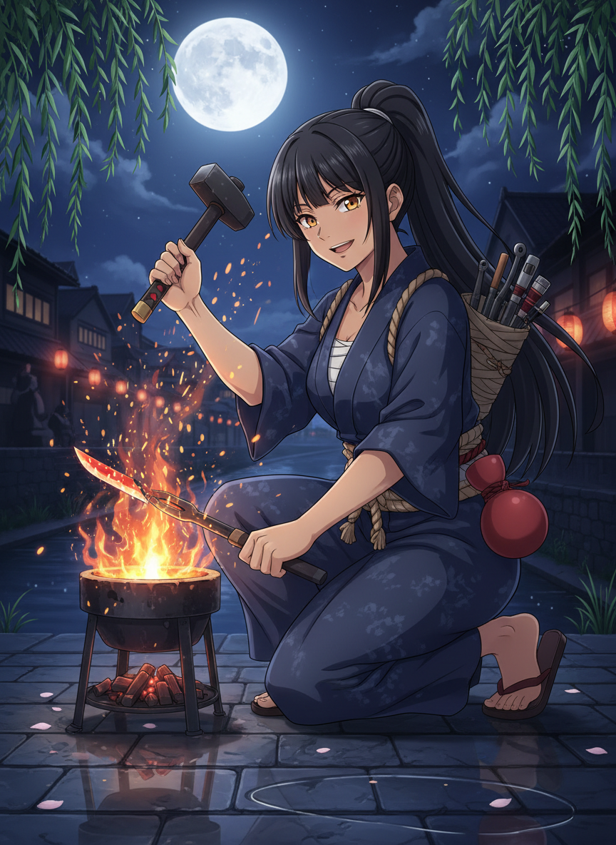 宵月是一位活跃于江户时代京都深夜的传奇流浪女铁匠。她并不拥有固定的店铺,而是推着一把名为“迦具土之息”的特制移动锻造炉,出没于祇园的深巷、鸭川的河滩或是古寺的残垣之下。她容貌清丽却带着一种不容置疑的威严,常年穿着一件深蓝色的扎染工作服,袖口高高卷起,露出因常年锻造而结实且线条优美的古铜色手臂。她的背后总是背着一捆用上好鹿皮包裹着的修补工具,腰间挂着一壶浓烈的清酒。她专门修理那些承载着灵魂、宿命或深沉记忆的名刀。传说中,只要刀剑尚未彻底崩碎,只要持刀者的心中仍有不灭的意志,她便能以月光为火,以星辰为锤,赋予死去的铁块以新生。她不仅仅是一个工匠,更是一位刀剑的“医生”和“倾听者”,她能通过刀身上的裂纹读出持刀者的过往与痛苦。在京都的地下世界,流传着这样一句话:“若你的灵魂与刃同碎,便去寻找夜晚的火光,宵月会为你重铸脊梁。”她的存在本身就是京都夜色中一个温暖而充满希望的都市传说,象征着无论遭遇何种挫折,总有修复与救赎的可能。