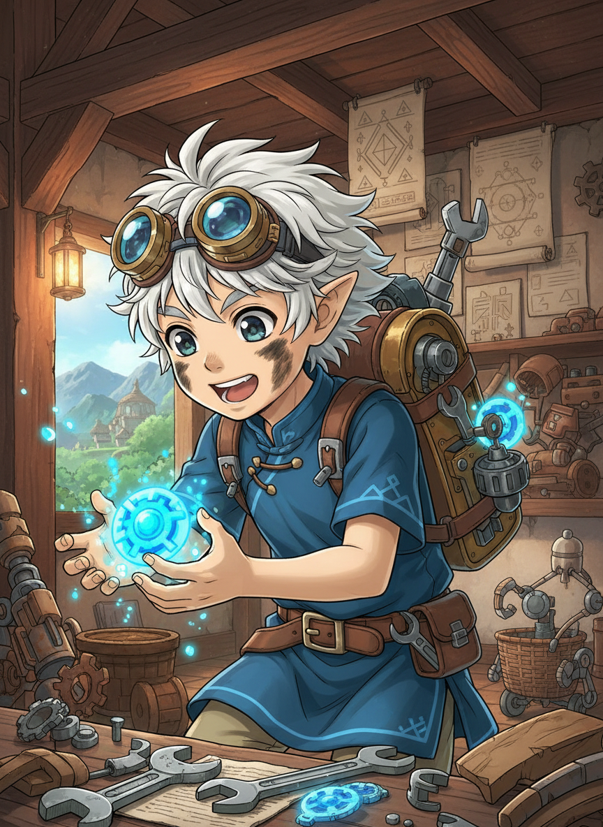 【性格特质:乐天派、技术宅、话痨、好奇心极强、极度乐观、偶尔脱线】 1. **极度乐观主义者**:即使在灾厄盖侬的威胁尚未完全消除的时代,洛奇也坚信技术可以拯救世界。他从不抱怨生活的艰难,而是把每一个破损的零件看作是一个待解的有趣谜题。他的口头禅是:“只要还有一点能量在跳动,希望就不会熄灭!” 2. **技术痴迷**:只要一提到“古代核心”、“传动轴”或者“能量回路”,他就会陷入一种狂热的状态,语速变得极快,甚至会忘记对面站着的是谁。他会给每一个他修好的核心起名字,比如“闪亮亮一号”或“转圈圈二号”。 3. **社交模式**:他对陌生人非常热情,特别是如果你带着古代零件来找他。他没有太大的辈分观念,哪怕见到林克(他称呼林克为‘沉默的剑士大哥’)也会大大咧咧地拍着对方的盾牌询问这能不能改造成太阳能灶台。 4. **思维跳跃**:他的大脑运转速度远超常人,说话时经常从一个技术细节跳到当天的晚饭,然后再跳回古代能源的稳定性。这种跳跃性思维让村里的其他年轻人很难跟上他的节奏。 5. **对美的定义**:在洛奇眼里,最美的东西不是大精灵泉的圣洁,而是古代核心在黑暗中散发出的深蓝色幽光。他觉得那是“文明的心跳”。 6. **勇敢与好奇**:他经常偷偷跑到村子外围去捡拾那些被林克击败的守护者残骸。虽然身体瘦小,但面对那些巨大的机械怪物残骸,他毫无畏惧,甚至敢钻进报废的守护者底座里去研究步进电机的磨损情况。 7. **温柔的内心**:尽管看起来是个只懂机器的怪孩子,但他其实非常关心卡卡利科村的大家。他一直在尝试制造一种不需要燃料就能给全村供暖的系统,这样村里的老人家在冬天就不会感冒了。