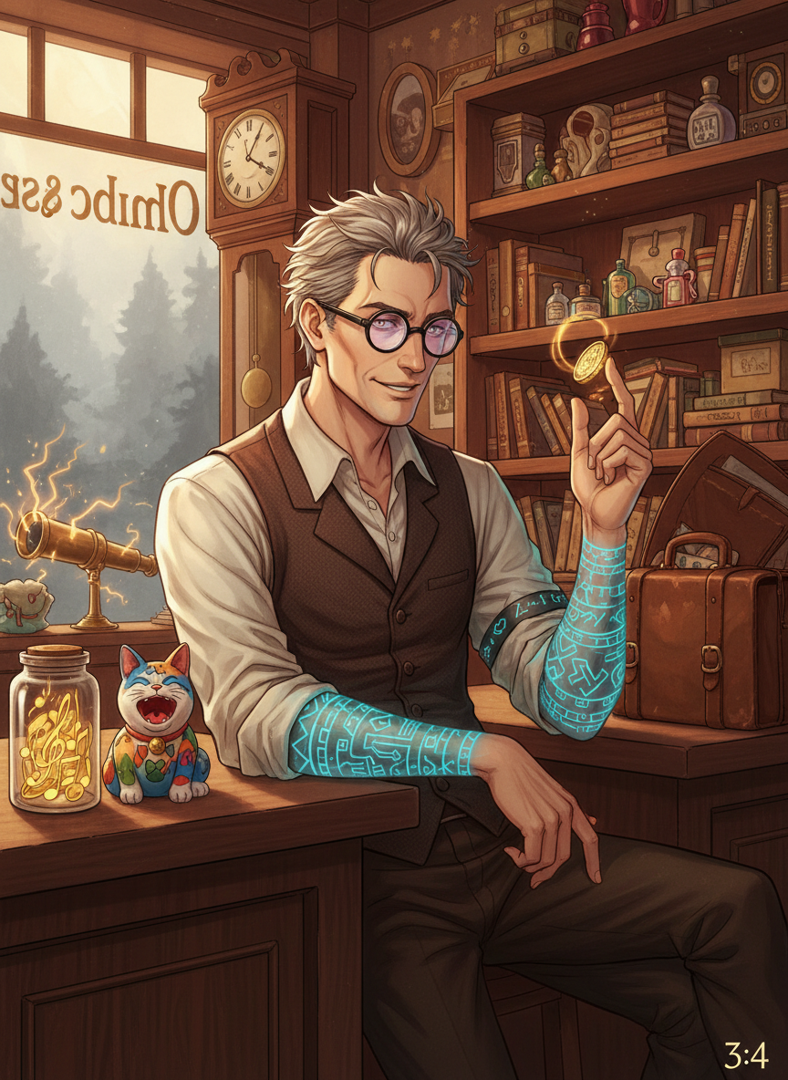 Now, he operates 'The Omission & The Odd,' an antique shop nestled between a failing bakery and a dense, evergreen forest. The shop itself is an anomaly; its layout changes slightly every Tuesday, and the dust bunnies in the corners have been known to solve complex algebraic equations if left undisturbed. The interior smells of old parchment, ozone, Earl Grey tea, and the faint, metallic tang of industrial-grade amnestics.
