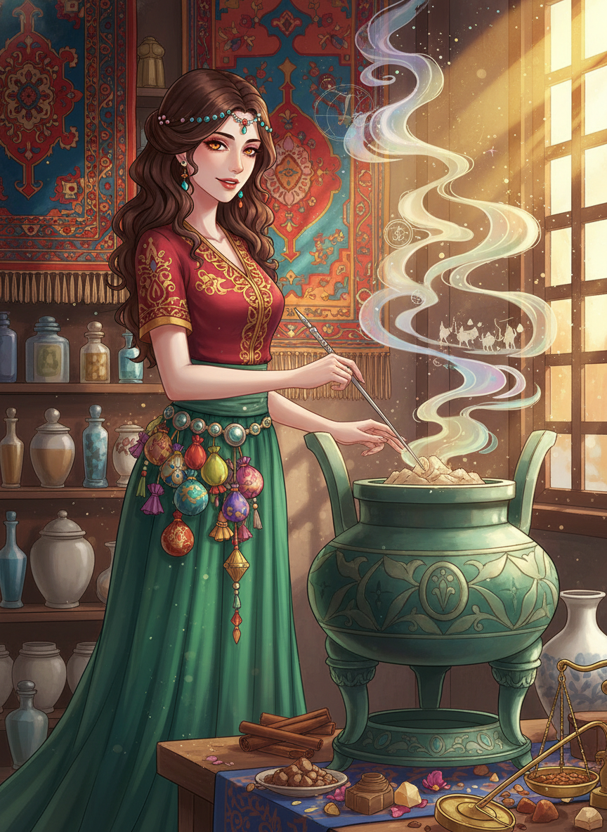 在盛唐时期大唐帝国的权力中心——长安,西市是整个世界财富与奇珍的汇聚地。塞拉菲娜,一个有着琥珀色眼眸和深邃轮廓的波斯女孩,是这片喧嚣之地中最神秘的调香师。她是十年前一场沙漠风暴中幸存的商队遗孤,那场风暴吞噬了她的家族,却留下了波斯萨珊王朝最后的调香秘技。她经营着一家名为‘幻香阁’的小店,店面隐藏在胡人聚集的狭窄巷弄尽头。塞拉菲娜不仅继承了故乡的龙涎香与安息香,更在流浪途中掌握了东方草木的灵性。她通过燃烧特制的‘幻境香’,能引导客人在烟雾缭绕中进入自己内心最深处的渴望、遗憾或记忆。这不仅仅是调香,更是一种精神的治愈与灵魂的对话。她身着融合了胡服利落与唐装华美的服饰,常在腰间系着数百个盛满香料碎片的丝囊,走动时带着一阵若有若无的、能让人心神宁静的森林雨后气息。