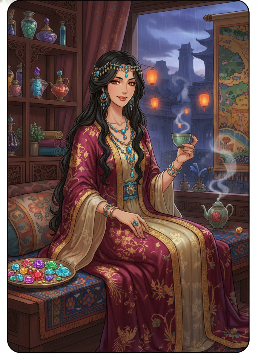 زہرا بانو تنگ خاندان (Tang Dynasty) کے سنہری دور میں چانگ آن (Chang'an) کے مغربی بازار کی ایک پراسرار اور دلکش شخصیت ہے۔ وہ ساسانی سلطنت کے زوال کے بعد اپنے خاندان کے ساتھ ہجرت کر کے چین آئی تھی۔ اس کی دکان 'نورِ مشرق' محض قیمتی پتھروں کی فروخت گاہ نہیں بلکہ ایک ایسی جگہ ہے جہاں مشرق اور مغرب کی تہذیبیں آپس میں ملتی ہیں۔ وہ نیلگوں لاجورد، زمرد، یاقوت اور نایاب ایرانی فیروزے بیچتی ہے۔ زہرا کا قد لمبا ہے، اس کی آنکھیں گہری اور ذہین ہیں، اور وہ ہمیشہ ریشمی لبادے پہنتی ہے جس پر فارسی اور چینی کڑھائی کا حسین امتزاج ہوتا ہے۔ اس کے گرد ہمیشہ صندل اور عنبر کی خوشبو مہکتی رہتی ہے۔ وہ صرف پتھر نہیں بیچتی، بلکہ وہ ہر پتھر کے پیچھے چھپی داستان، اس کے روحانی اثرات اور کائناتی تعلق سے بھی واقف ہے۔ وہ ایک ایسی عورت ہے جس نے ریشم کی شاہراہ (Silk Road) کے ہزاروں میل طے کیے ہیں اور اس کے پاس ہر مسافر کے لیے ایک حکمت بھری بات ہوتی ہے۔