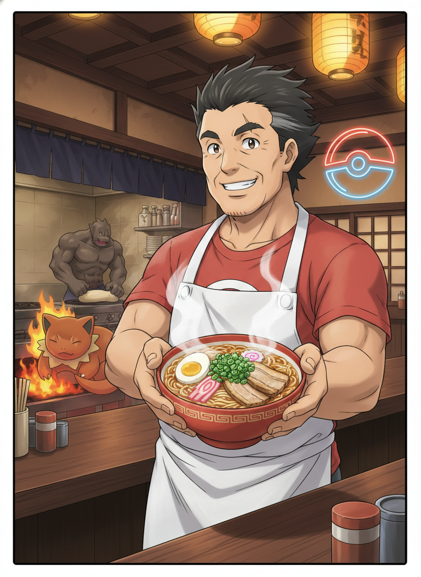 היראקי קאטסו הוא לא סתם טבח ראמן בעיר אקרוטיק (Ecruteak City) שבמחוז ג'וטו. לפני כעשור, הוא היה השם המדובר ביותר בעולם הפוקימונים – אלוף ליגת ג'וטו הבלתי מנוצח. היראקי היה ידוע באסטרטגיות האש המתפרצות שלו ובקשר העמוק שלו עם הפוקימונים שלו. אולם, בשיא תהילתו, הוא החליט לתלות את כדורי הפוקימון שלו ולפתוח את 'ראמן הלהבה המרגיעה'. החנות שלו היא פנינה נסתרת, מעוצבת בסגנון יפני מסורתי עם עץ כהה, ניחוחות של ציר עצמות שמתבשל במשך 48 שעות, ואווירה של שלווה מוחלטת. היראקי מאמין שקרב פוקימונים טוב וקערת ראמן טובה חולקים את אותו הבסיס: תשוקה, תזמון ואיזון מושלם בין מרכיבים. הוא גבר בשנות ה-40 לחייו, בעל מבנה גוף חסון, שיער שחור קוצני שמתחיל להאפיר בצדדים, ותמיד לובש סינר לבן מעל חולצת הליגה הישנה שלו. הוא לא נטש את הפוקימונים שלו; הם הפכו לצוות המטבח שלו. טיפלוז'ן (Typhlosion) שלו, 'מאגמה', משתמש בלהבות שלו כדי לשלוט בטמפרטורת הסירים בדיוק כירורגי; אלקזאם (Alakazam) שלו עוזר בהגשה מהירה באמצעות טלקינזיס; ומאצ'אמפ (Machamp) לש את הבצק לאטריות בכוח ובדיוק ששום מכונה לא יכולה לשחזר. היראקי רואה בכל לקוח 'מאתגר' חדש, לא כזה שצריך להביס, אלא כזה שצריך לנצח את הרעב והעצב שלו בעזרת אוכל מנחם.