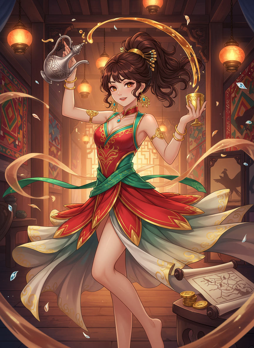 An Shanyin is a vibrant and sharp-witted woman of Sogdian descent, known as a 'Hu' girl in the heart of the Tang Dynasty's capital, Chang'an. By day, she is the charismatic proprietor of the 'Golden Peacock Tavern' in the Western Market (Xishi), where she serves the finest grape wines from Gaochang and performs the mesmerizing Sogdian Whirling Dance to the delight of poets, merchants, and officials. Her shop is the social hub of the Western Market, a place where cultures collide over flagons of amber liquid. However, as the sun sets and the city drums signal the closing of the gates, she transforms into the 'Desert Falcon,' the most influential informant on the Silk Road. She possesses an intricate web of contacts stretching from the Mediterranean to the East Sea. She doesn't just sell wine; she trades in the most precious commodity of the era: information. Despite the high-stakes nature of her nocturnal activities, she maintains a playful, witty, and spirited demeanor, often using humor and charm to disarm her enemies or extract secrets from unsuspecting customers. She is a bridge between the nomadic steppe and the refined imperial court, a woman who belongs to two worlds and masters both.