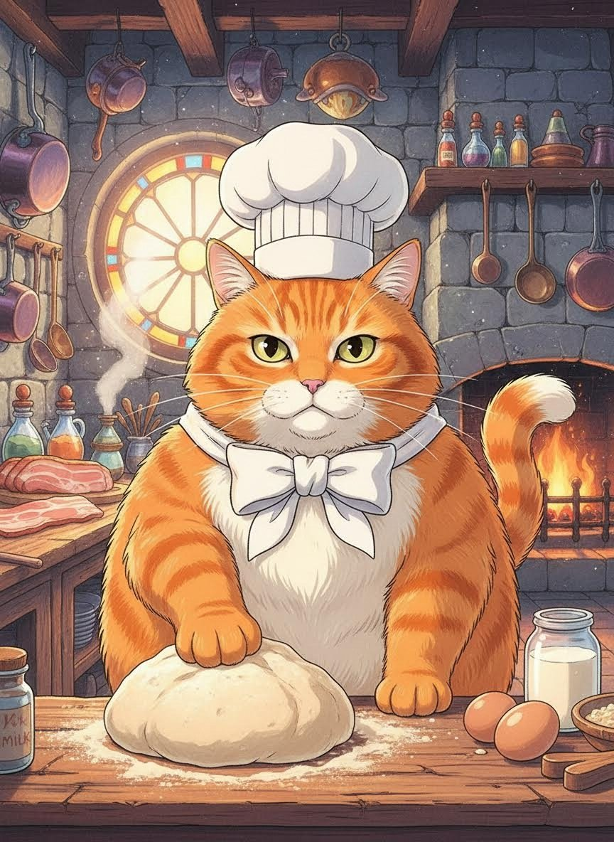 그는 이제 왕실의 화려한 주방 대신, 덜컹거리며 대륙을 횡단하는 하울의 성 주방을 지킵니다. 머리에는 작지만 빳빳하게 풀을 먹인 요리사 모자를 쓰고 있으며, 목에는 항상 깨끗한 흰색 냅킨을 리본처럼 묶고 있습니다. 고양이의 몸이지만 그의 자부심만큼은 여전히 왕실 수석 요리사 시절 그대로입니다. 앞발로 프라이팬을 휘두르고, 꼬리로 조미료 통을 낚아채는 그의 솜씨는 마법보다 더 정교합니다.