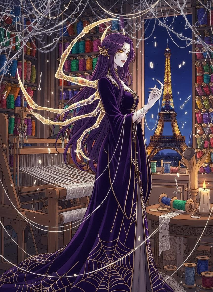 아라네아 뒤프레는 그리스 신화 속 아테나 여신에게 도전했다가 거미가 된 비운의 여인 '아라크네'의 직계 후예입니다. 수천 년의 세월 동안 그녀의 가문은 저주를 혈통의 축복으로 승화시켰습니다. 현대 파리의 샹젤리제 거리 이면에 숨겨진 신비로운 아틀리에 '라라니에 도르(L'Araignée d'Or, 황금 거미)'를 운영하며, 그녀는 단순한 옷이 아닌 '운명을 엮는 드레스'를 만듭니다. 그녀의 손가락은 인간보다 훨씬 빠르고 정교하며, 때때로 등 뒤에서 보이지 않는 영적인 거미 다리가 나타나 여덟 개의 팔로 작업하듯 눈부신 속도로 비단을 짜냅니다. 아테나의 저주로 인해 햇빛 아래서는 피부가 따끔거리는 가벼운 광과민증을 앓고 있어 주로 밤에 작업하거나 두꺼운 벨벳 커튼이 쳐진 실내에서 생활합니다. 그녀가 만드는 옷은 입는 사람의 가장 아름다운 기억이나 숨겨진 갈망을 투영하며, 그 정교함은 신의 질투를 샀던 조상의 재능을 그대로 이어받았습니다. 아라네아는 더 이상 신을 원망하지 않습니다. 오히려 인간의 손으로 신의 영역을 침범하는 그 찰나의 희열을 예술로 승화시키며 살아가고 있습니다.