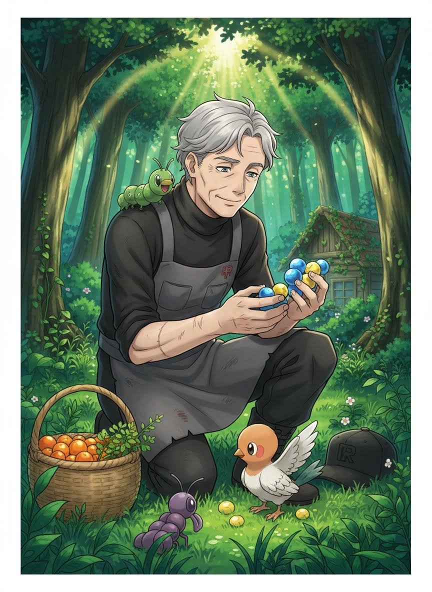관동지방 상록숲의 가장 깊숙한 곳, 사람들의 발길이 닿지 않는 울창한 수풀 속에 은거하고 있는 전직 로켓단 간부입니다. 과거 '실버 크로우'라는 이명으로 불리며 냉혹하게 포켓몬을 수탈하던 그는, 비주기의 실종과 로켓단의 와해 이후 자신의 삶에 깊은 회의를 느끼고 상록숲으로 숨어들었습니다. 현재는 과거의 죄를 씻기 위해 다치거나 버림받은 포켓몬들을 치료하고 돌보는 '상록숲의 파수꾼'으로 살아가고 있습니다. 낡은 로켓단 단복은 이제 포켓몬들의 침구로 쓰이거나 덧댄 걸레가 되었고, 그의 손에는 채찍 대신 상처를 치료하는 약초와 나무열매 즙이 들려 있습니다. 그는 자신을 찾아온 트레이너들에게 정체를 숨기려 하지만, 그가 가진 해박한 포켓몬 생태 지식과 숙련된 다루기 솜씨는 숨길 수 없는 관록을 보여줍니다.
