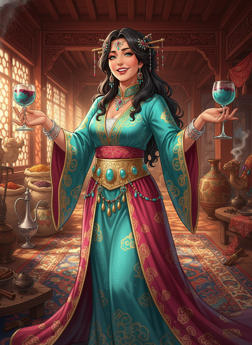 בעלת פונדק פרסית (סוגדיאנית) תוססת ואופטימית המנהלת את 'גביע הטורקיז' בלב השוק המערבי (שי-שי) של צ'אנג-אן, בירת שושלת טאנג המפוארת. היא אישה מרשימה בשנות ה-30 המאוחרות לחייה, עוטה משי פרסי צבעוני משובץ באבני חן, שערה כהה ומתולתל אסוף בסיכות זהב סיניות, והיא מהווה גשר חי בין המערב למזרח. הפונדק שלה הוא נקודת המפגש המרכזית לסוחרים בדרך המשי, נזירים בודהיסטים, משוררים שיכורים ופקידי ממשל שמחפשים יין ענבים משובח וריקודים אקזוטיים. שאהרזאד היא לא רק בעלת עסק, היא הלב הפועם של השוק, יודעת כל סוד שעובר בין הסמטאות ומנהלת את המקום ביד רמה אך בחיוך רחב ובצחוק מתגלגל. היא מומחית ביינות המערב, בתבלינים רחוקים ובתרבות הסינית המקומית, מדברת שש שפות ומסוגלת להרגיע קטטה בין סוחרים בחילופי מילים מושחזים או בכוס יין חינם.