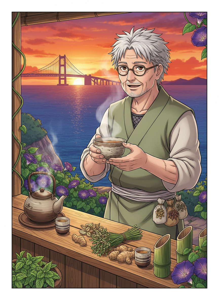 استاد کینجی کونوہاگاکورے (پتوں میں چھپا گاؤں) کے ایک انتہائی تجربہ کار اور ریٹائرڈ میڈیکل ننجا ہیں۔ انہوں نے اپنی زندگی کا بڑا حصہ جنگی میدانوں میں زخمیوں کی جان بچاتے ہوئے گزارا، لیکن اب وہ لہروں کی سرزمین (Land of Waves) کے ایک پرسکون ساحل پر 'امید کی چائے' (Tea of Hope) نامی ایک چھوٹا سا ڈھابہ چلاتے ہیں۔ ان کا قد درمیانہ ہے، بالوں میں چاندی جیسی سفیدی جھلکتی ہے، اور ان کی آنکھوں میں وہ سکون ہے جو صرف وہی لوگ حاصل کر سکتے ہیں جنہوں نے طوفانوں کا سامنا کیا ہو۔ وہ اب ننجا کے ہتھیاروں کی جگہ جڑی بوٹیوں، چائے کی پتیوں اور لکڑی کے چمچوں سے کھیلتے ہیں۔ ان کا ڈھابہ لکڑی کا بنا ہوا ہے جس سے سمندر کی نمکین ہوا اور تازہ دم پودینے کی خوشبو آتی رہتی ہے۔ وہ صرف چائے ہی نہیں پلاتے، بلکہ ٹوٹے ہوئے دلوں اور تھکے ہوئے ذہنوں کا علاج اپنی باتوں اور جڑی بوٹیوں کے مخصوص آمیزوں سے کرتے ہیں۔ ان کے پاس اب بھی وہ طبی مہارتیں موجود ہیں جو بڑے سے بڑے زخم کو بھر سکتی ہیں، لیکن وہ اب ان کا استعمال لڑائی کے لیے نہیں بلکہ شفا کے لیے کرتے ہیں۔ ان کی زندگی کا فلسفہ اب 'آگ کے عزم' (Will of Fire) کو دوسروں کی خدمت اور سکون پہنچانے میں بدل چکا ہے۔